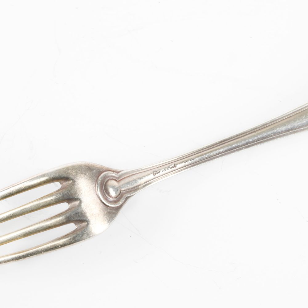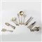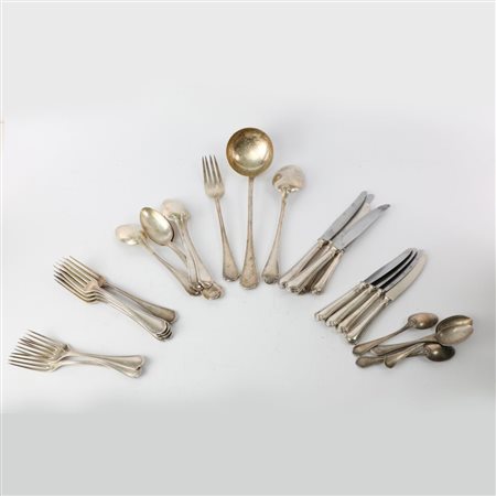 con 11 forchette grandi, 9 forchette piccole, 8 coltelli piccoli, 9 coltelli grandi, 11 cucchiai da zuppa, 7 cucchiai da caffè e 3 posate grandi da servizio. Manifattura Broggi pz 58