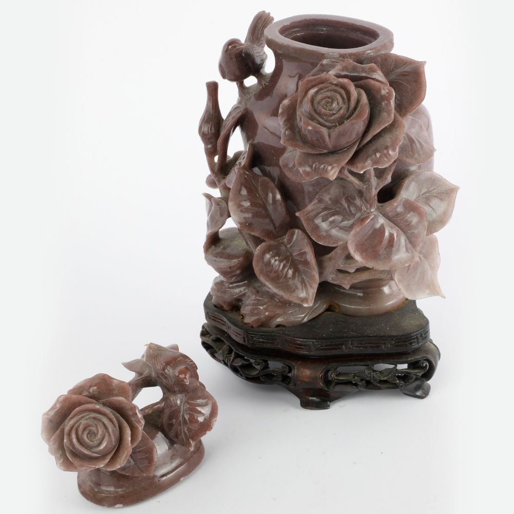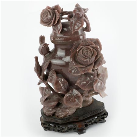 Potiches in materiale lapideo con decoro floreale ed animali metà XX secolo 21 x 12 x 7 cm