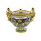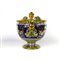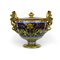 35 x 18 cm anse ad arpia, corpo globulare piede a disco. Decoro a mascheroni ed animali fantastici in oro su fondo bleu, consorzio Cima Perugia. Firma con dedica sotto al piede