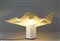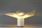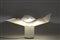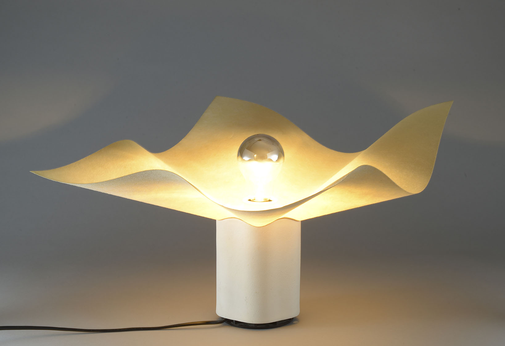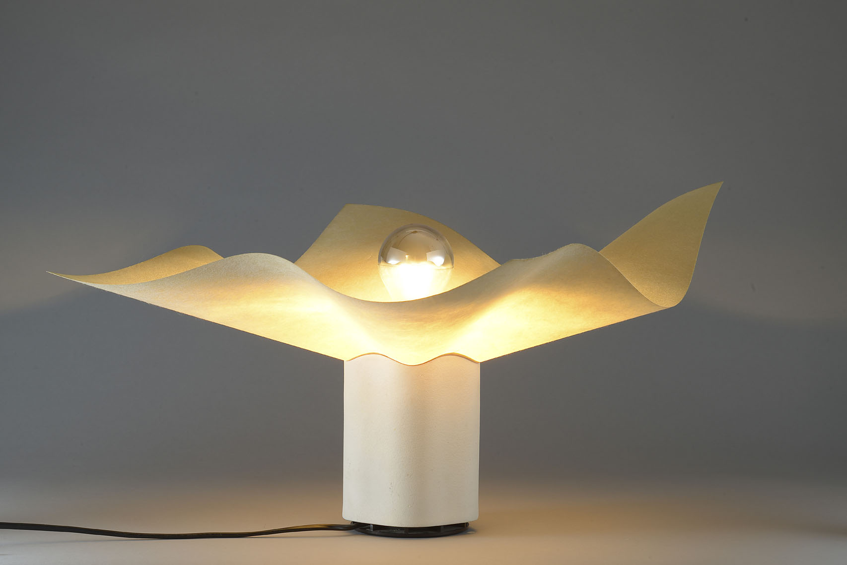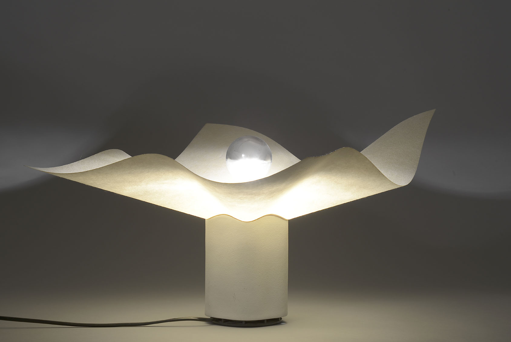 References: Designer's description: "The intangible nature of light led me, in my next lamp to move away from an attachment to things and objects and to reduce the lamp to a synthesis of 'effect' and 'gesture'. The gesture of the twist of a translucent sheet that is just enough to conduct and disseminate the right amount of light, and the effect, accentuated by the impossible coincidence of the square sheet and the five swelling areas that distort it, to remind one of the unpredictable nature of the sky and clouds "