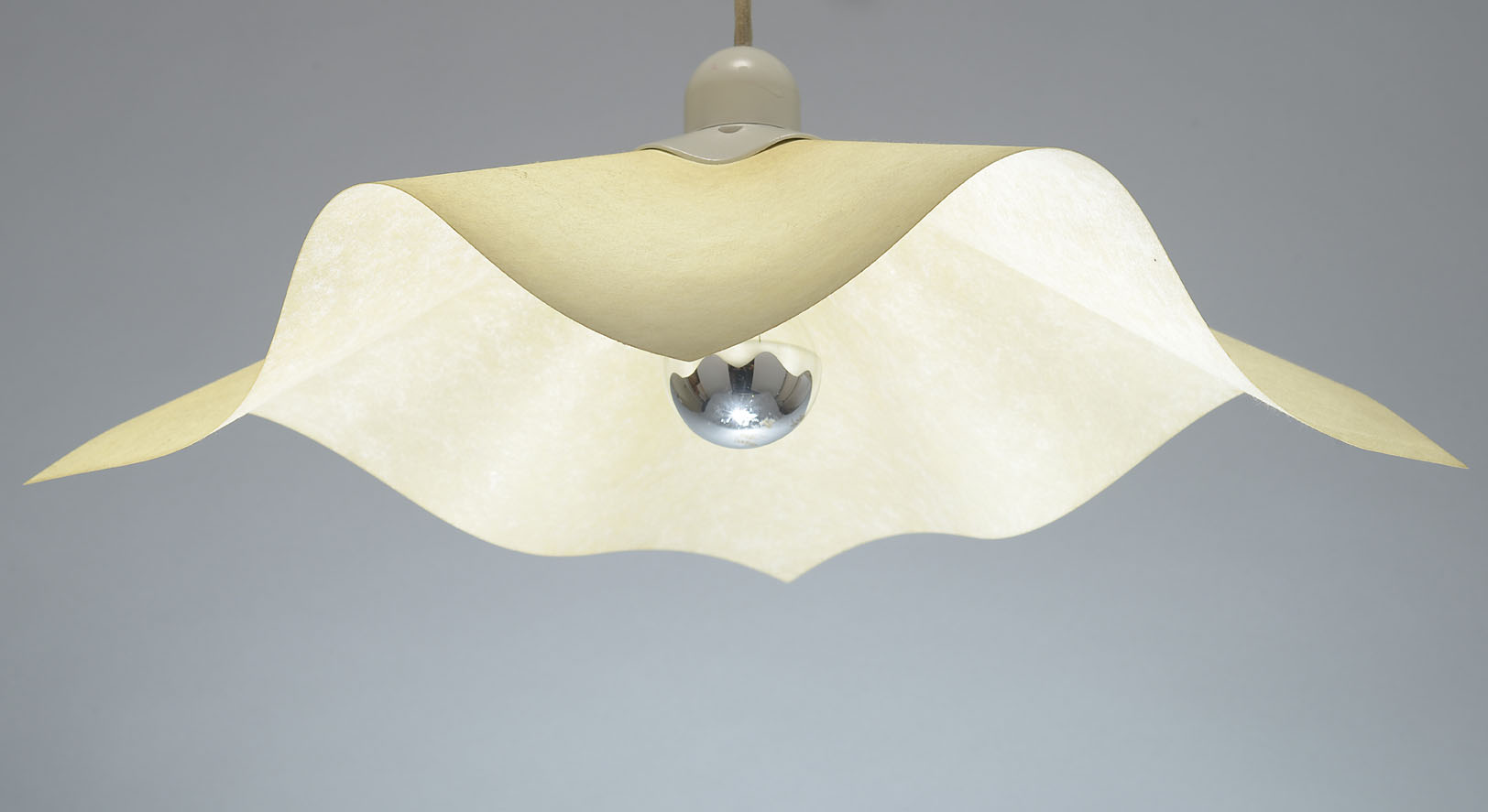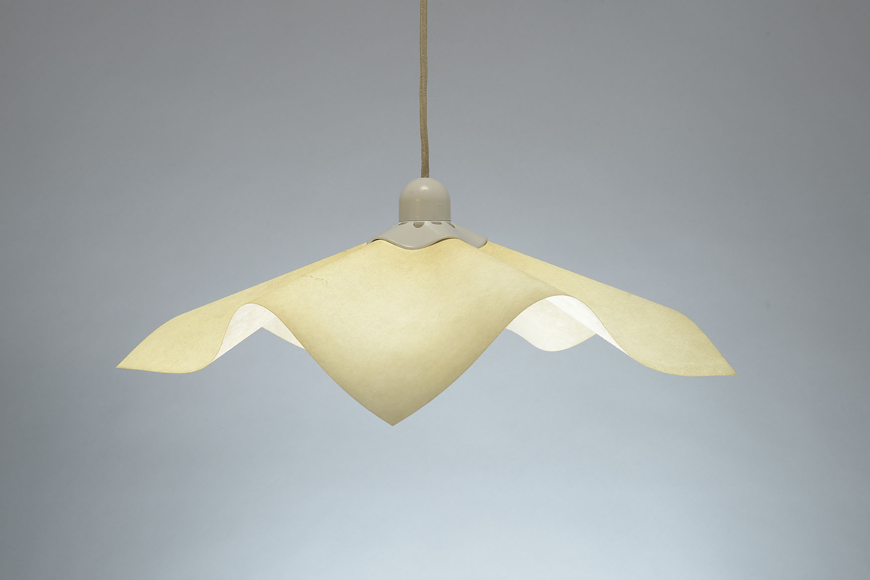 References: Designer's description: "The intangible nature of light led me, in my next lamp to move away from an attachment to things and objects and to reduce the lamp to a synthesis of 'effect' and 'gesture'. The gesture of the twist of a translucent sheet that is just enough to conduct and disseminate the right amount of light, and the effect, accentuated by the impossible coincidence of the square sheet and the five swelling areas that distort it, to remind one of the unpredictable nature of the sky and clouds "