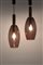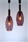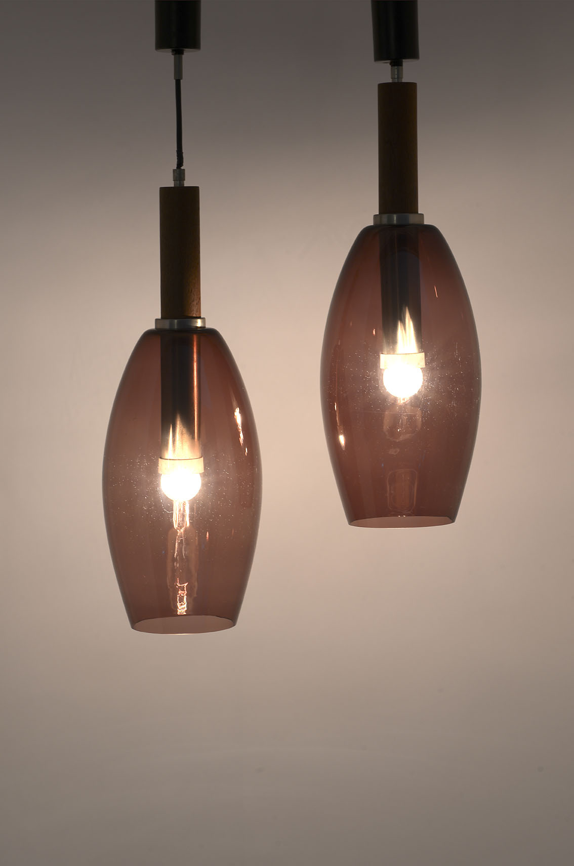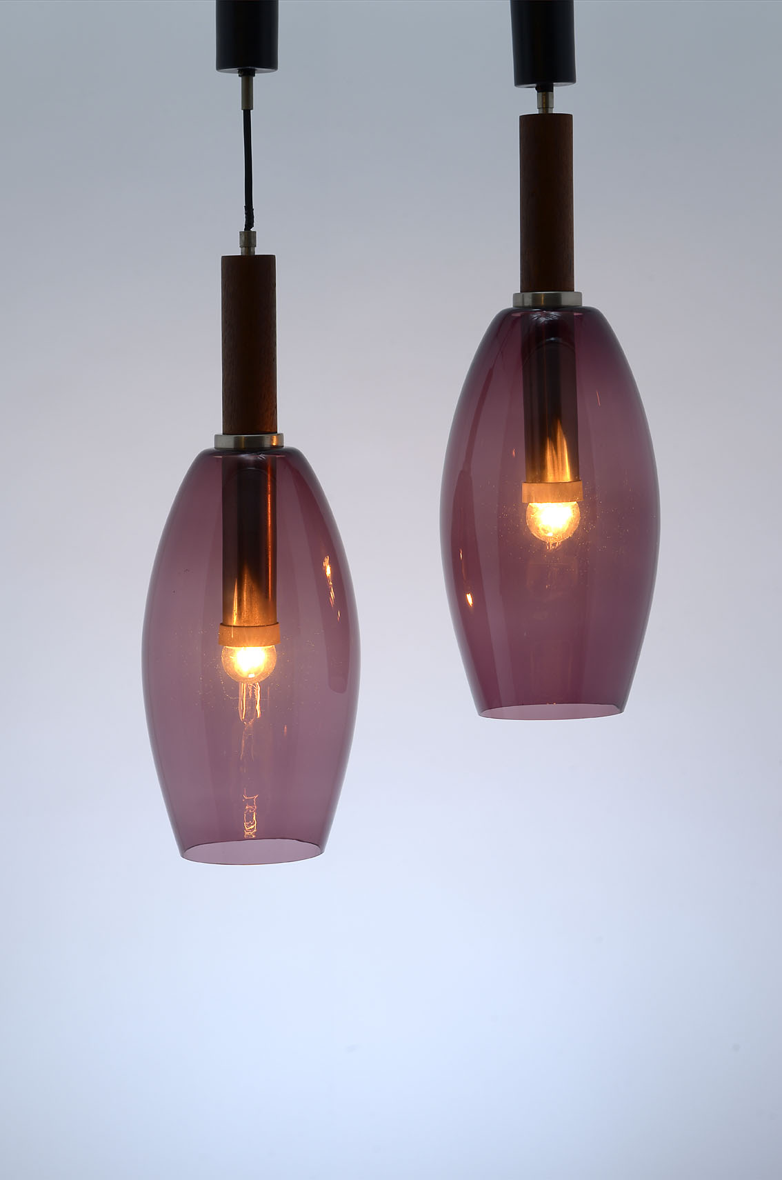 A pair of amethyst-coloured blown glass suspension lamps with wooden lamp holder stems. Braided cable.
