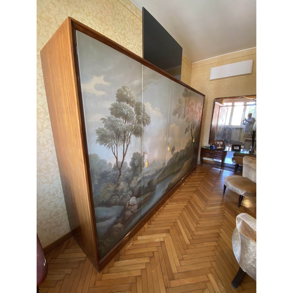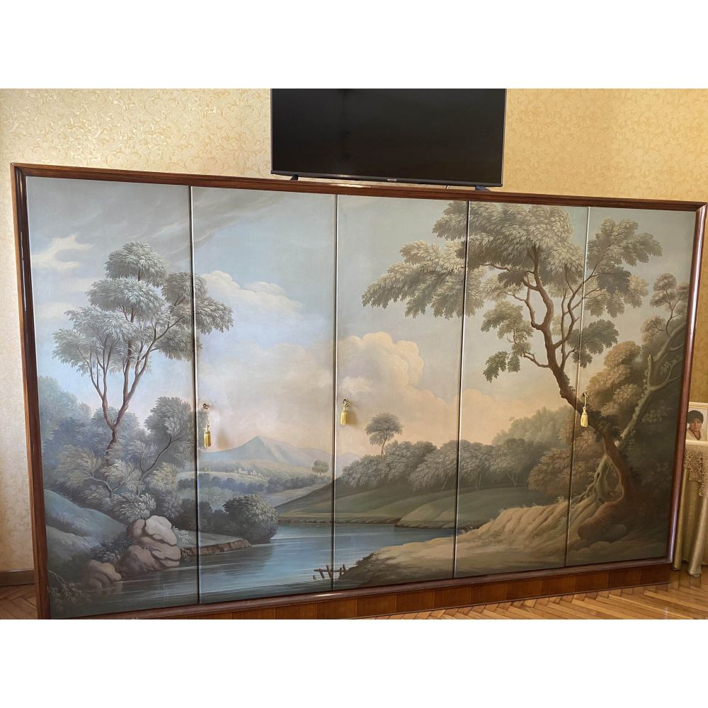 300 x 194 x 60 cm a 5 sportelli decorati con scorcio di fiume con montagne ed alberi. Opera ubicata presso la dimora romana dell'affidante.