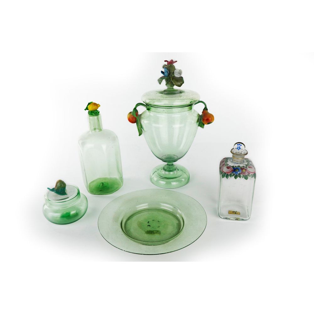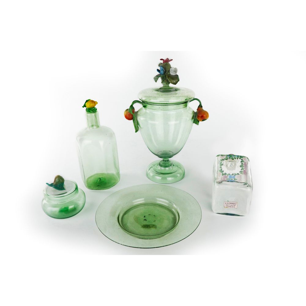 Lotto di 4 recipienti ed 1 piatto in vetro Murano inizi XX secolo