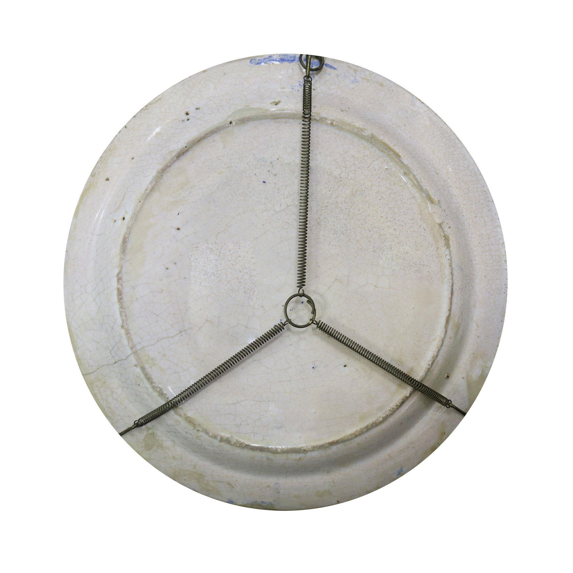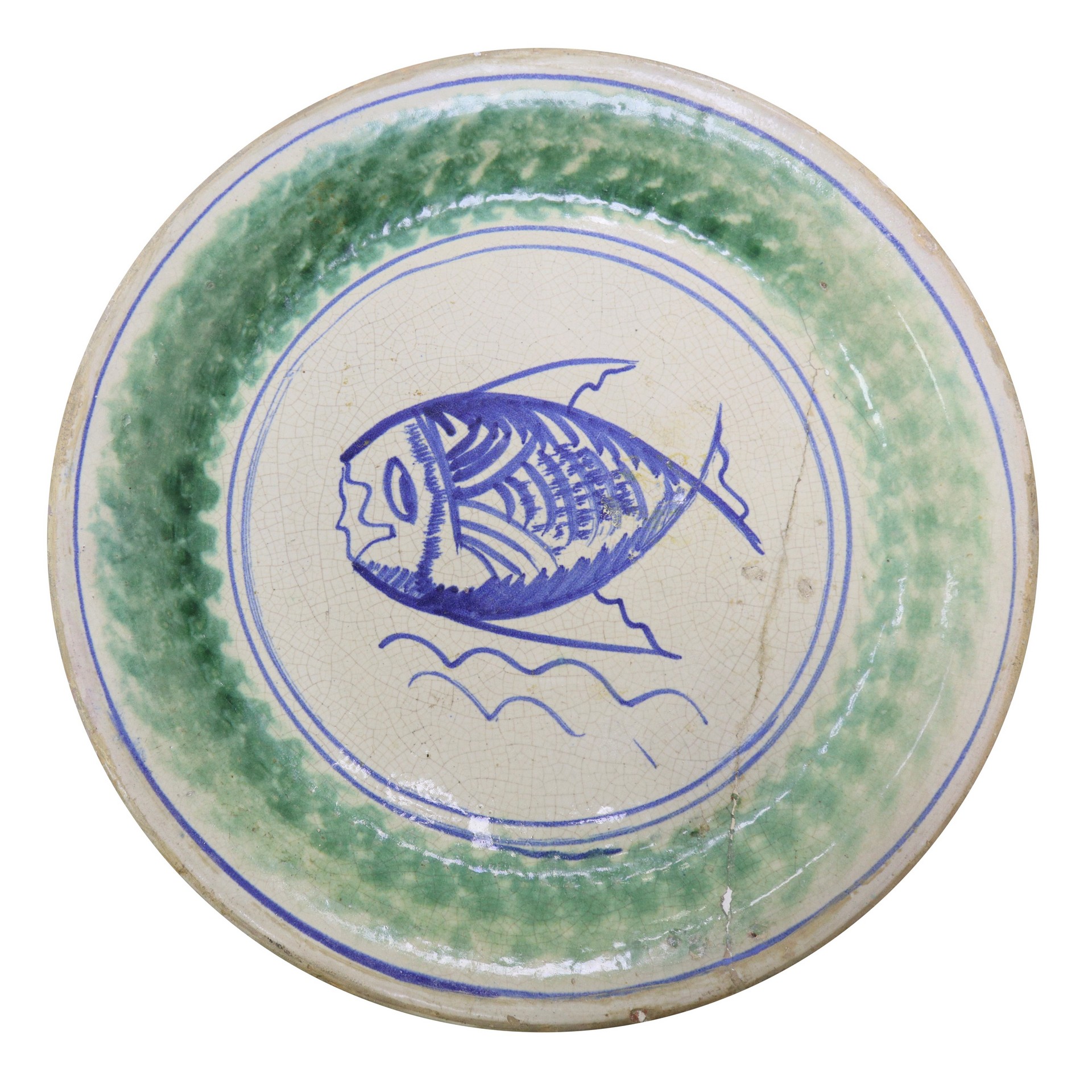 Piatto in maiolica di Caltagirone circonferenza spugnata verde, Primi del 20° secolo diametro cm 45 Al centro pesce. Filato.Al centro pesce. Filato.
