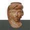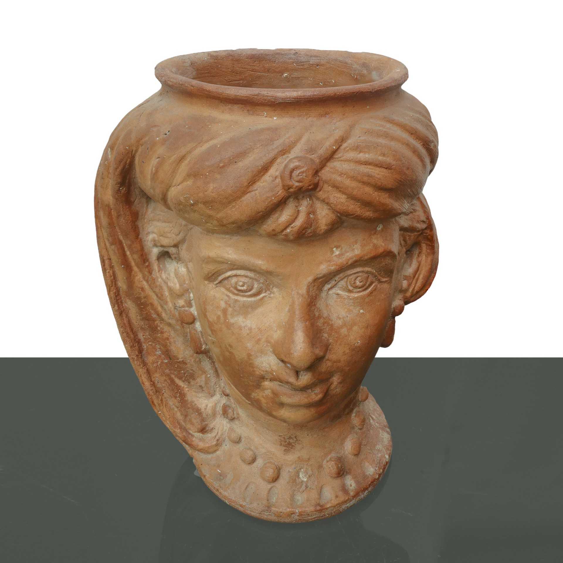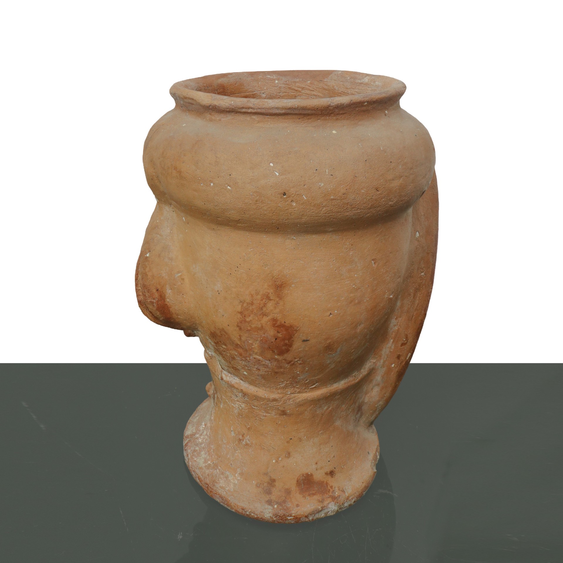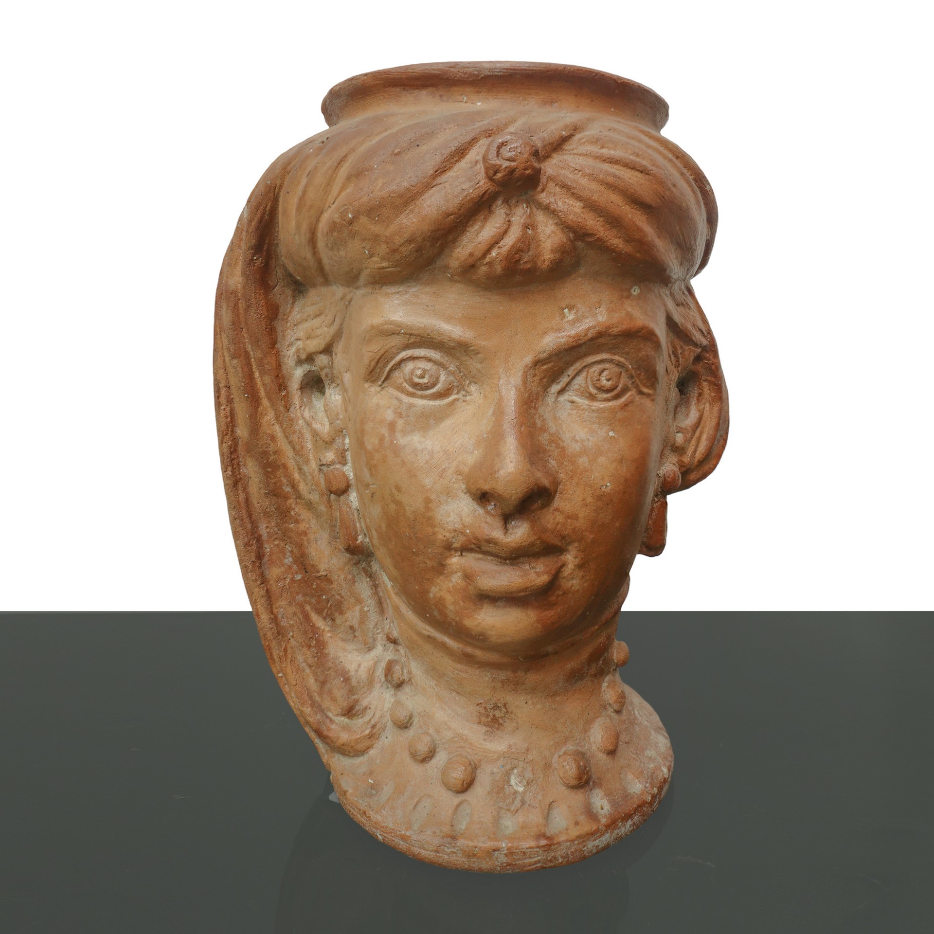 Vaso in terracotta raffigurante testa di donna con turbante e orecchini