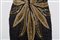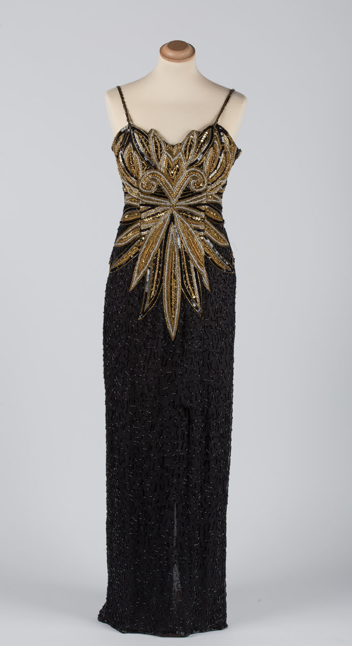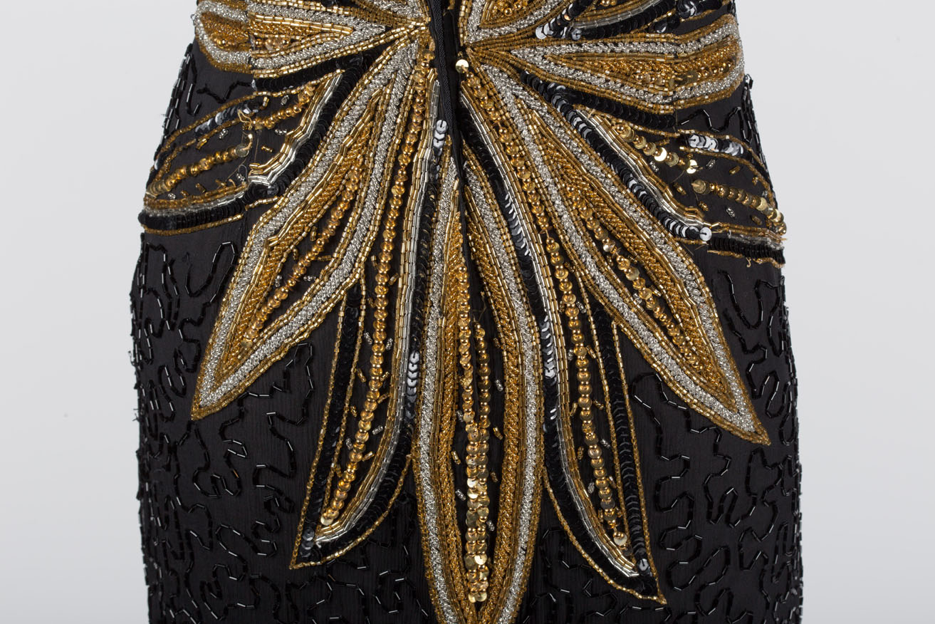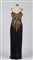 A black floor-length evening dress with impressive black silver and gold beaded embroidery in the central area.