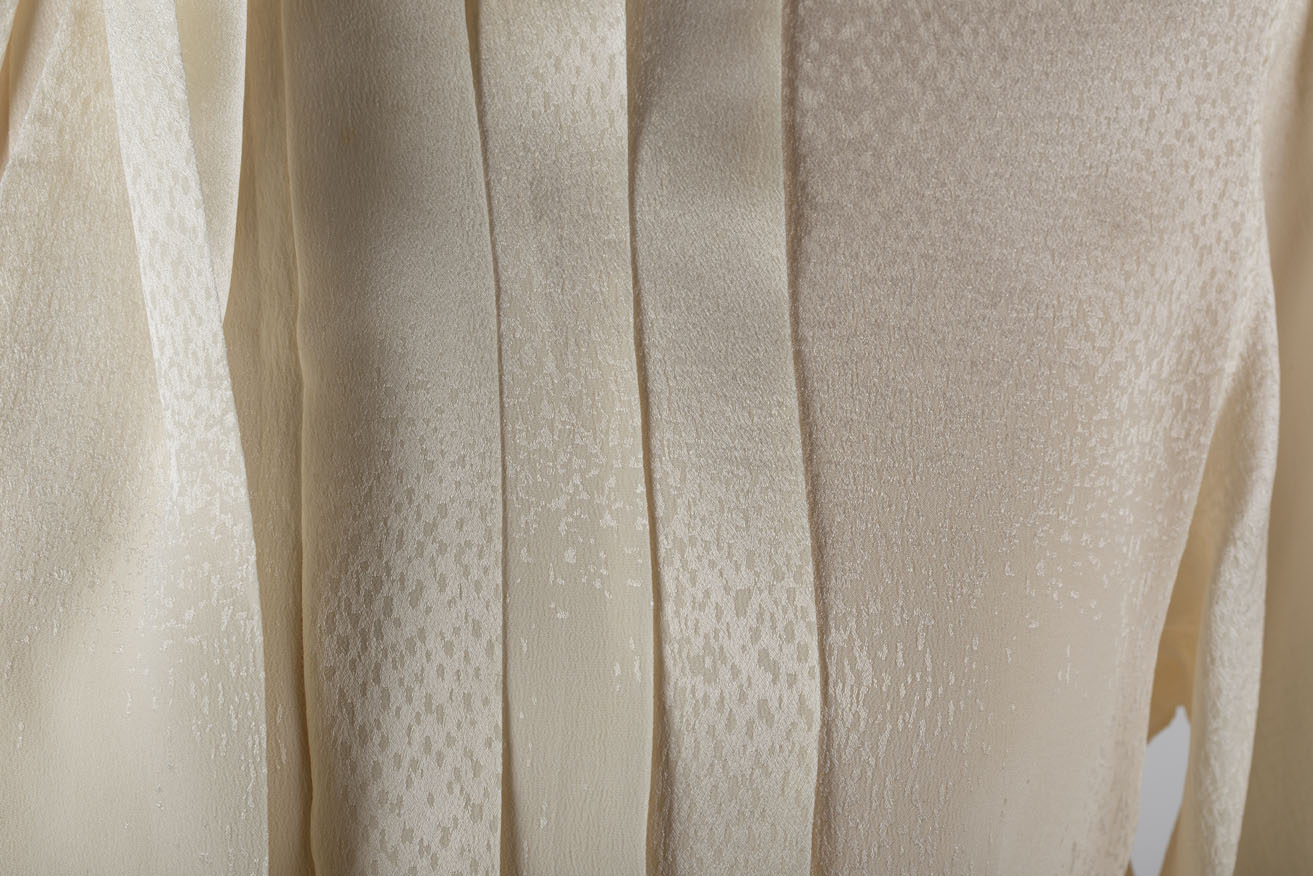 An outfit consisting of a cream-coloured silk blouse and beige suede skirt.