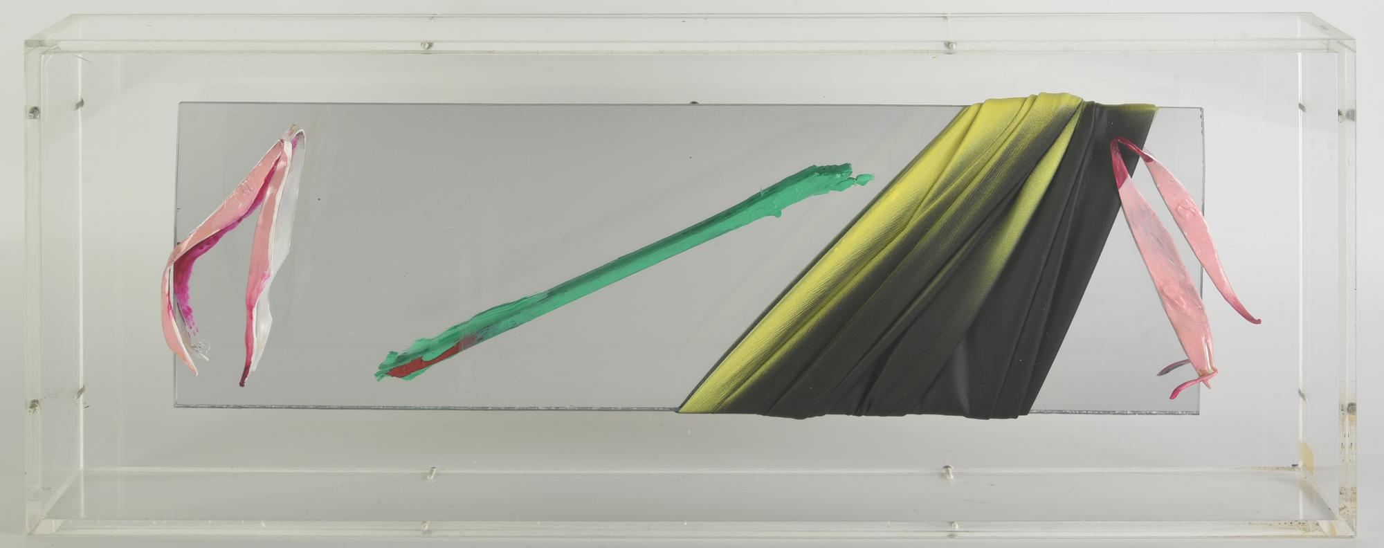 tecnica mista su specchio applicato su tavola, cm 10x32,5