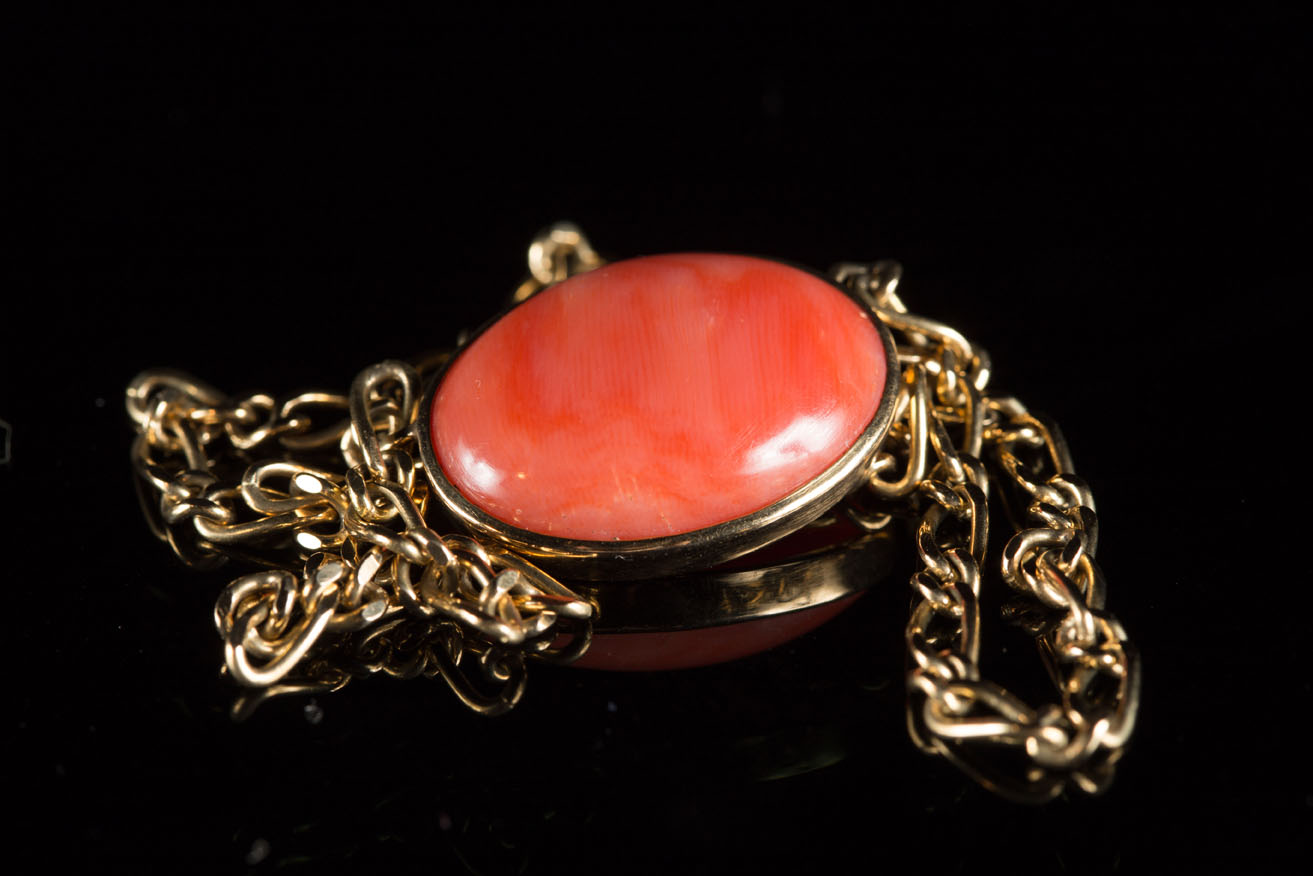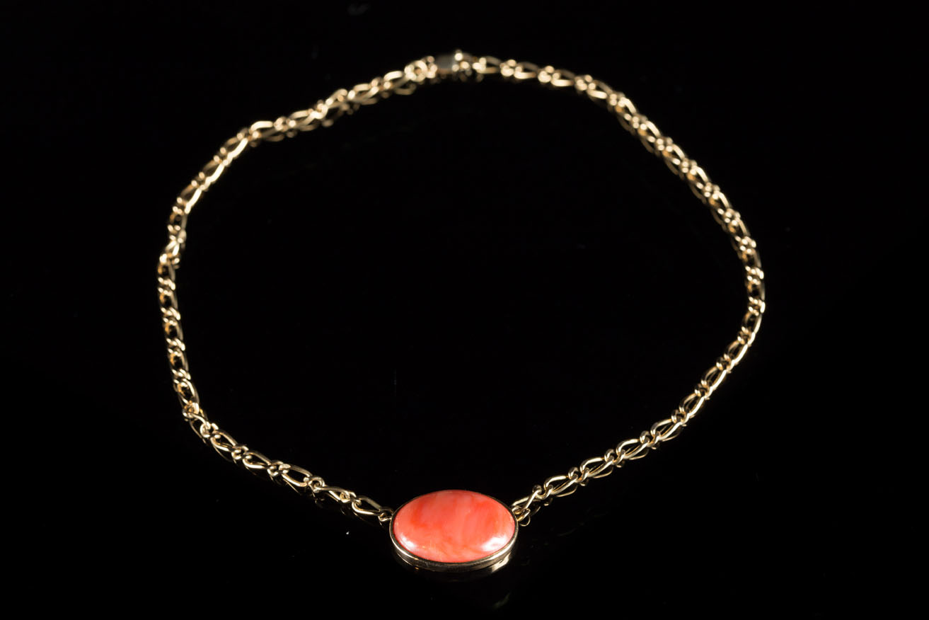 A 750 yellow gold necklace, gr 21, embellished with very fine coral from Sciacca, Sicily.