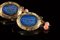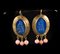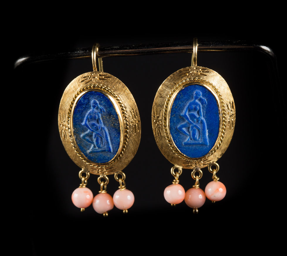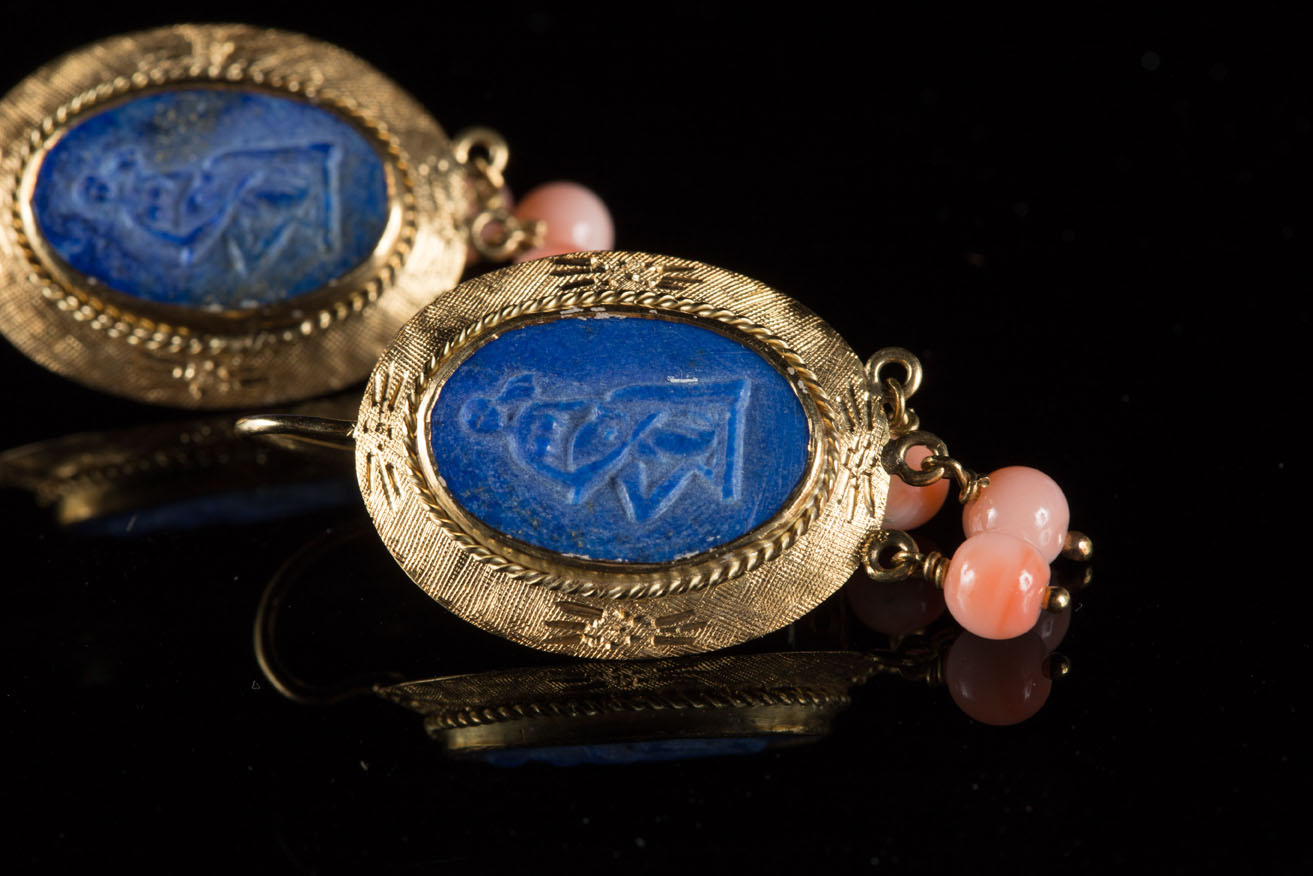 Elegant yellow gold earrings, with hand-engraved lapislazuli and small pink coral pendants.