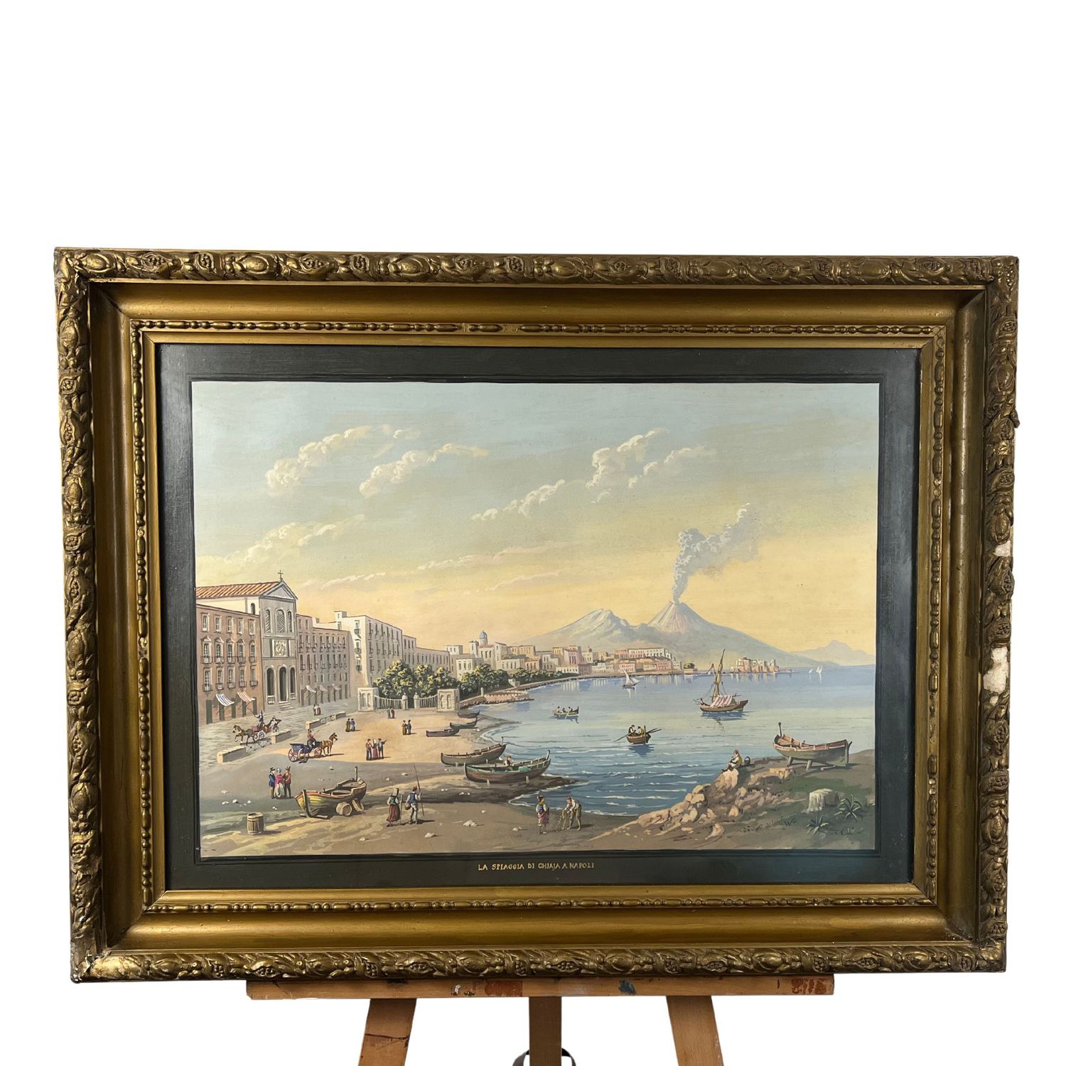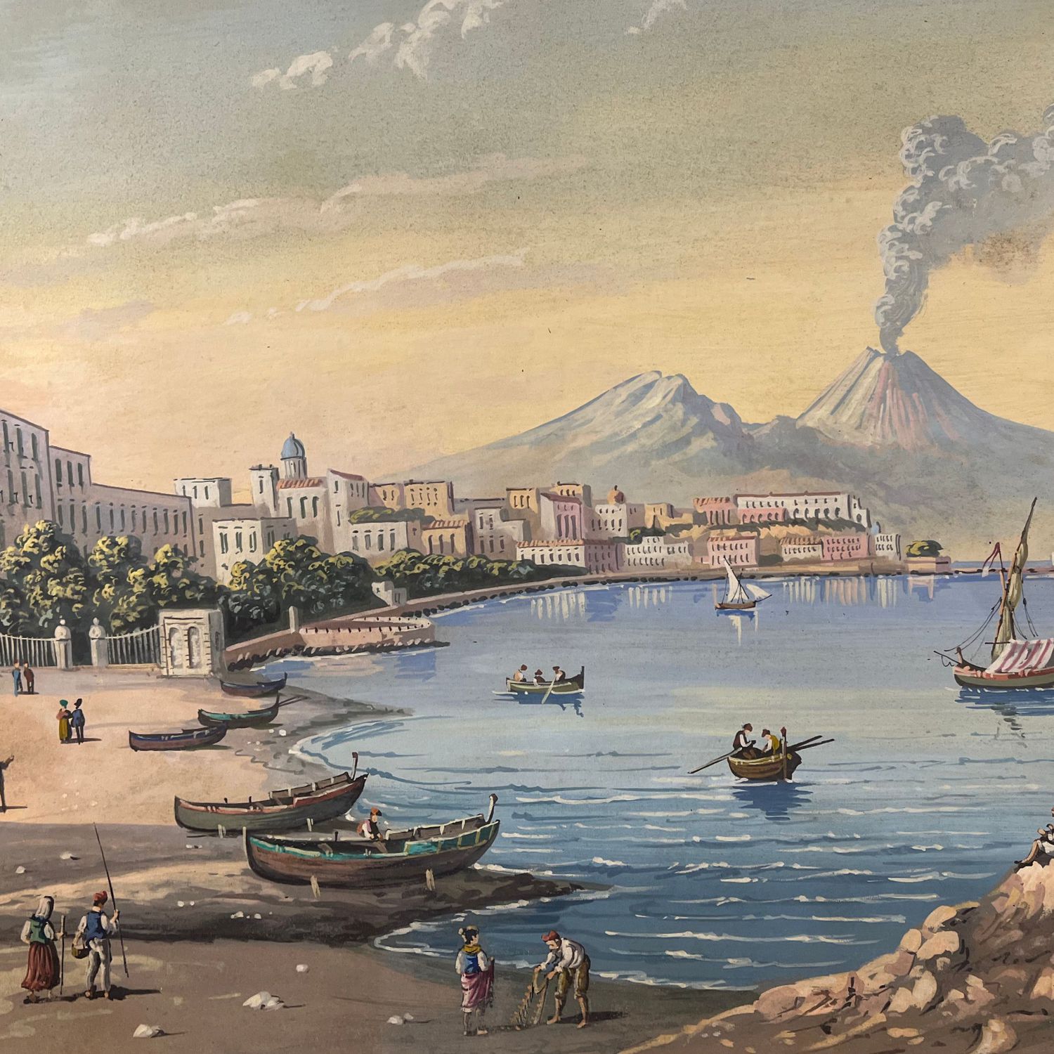 Dipinto guazzo (tempera su carta) napoletano, periodo XX secolo, scuola Napoletana raffigurante la spiaggia di Chiaia a Napoli.