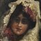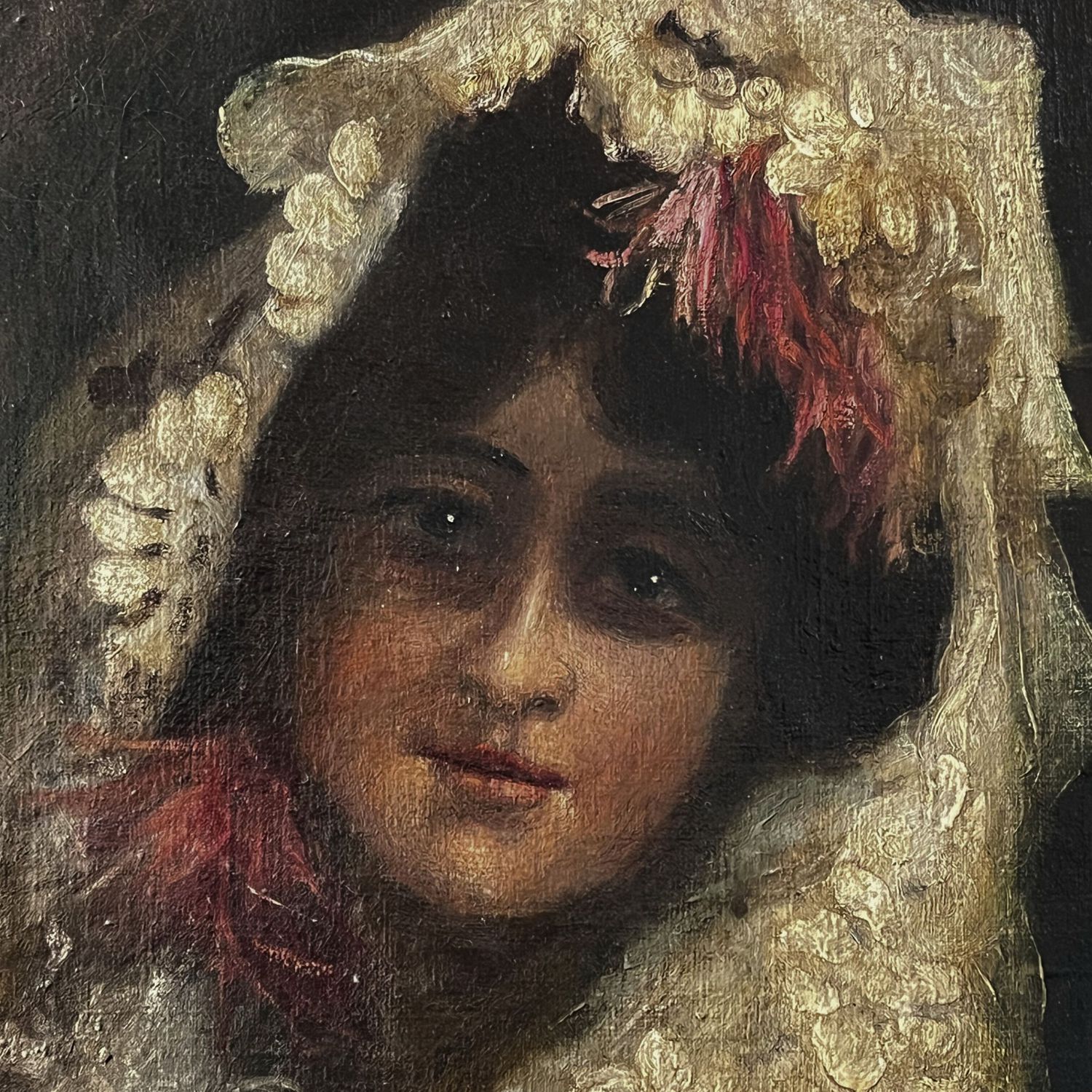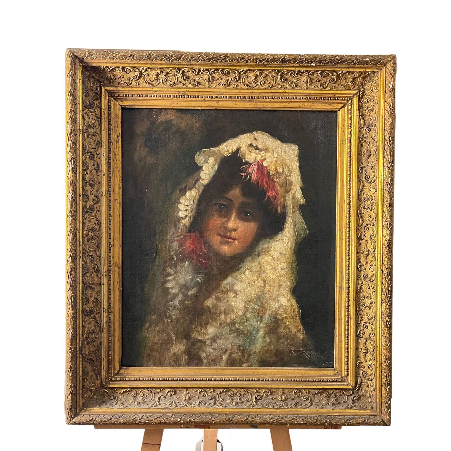 Il bianco cangiante della mantiglia che ricopre il capo della giovane sposa colpisce e affascina proprio come l’espressione della protagonista che tradisce l’attesa e l’emozione dell’evento che di li a poco le cambierà la vita. Il profumo e l’atmosfera della brulicante Napoli di primo ‘900 si ritrova nel tratto veloce e nella pennellata piena e vibrante con cui è stato realizzato il ritratto. Il fondo nero quasi graffiato al punto da far venire alla luce la preparazione della tela, contribuisce a dare l’effetto sfuocato che ha caratterizzato le produzioni accademiche del periodo, in cui le sperimentazioni pittoriche si fondevano con quelle fotografiche alla ricerca di una nuova, accattivante identità. I colori, perfettamente bilanciati tra i toni caldi e le ombre dell’incarnato e il bianco di biacca del velo e del vestito, acquisiscono vaporosità e leggerezza in una pennellata immediata e poco costruita. Anche la cornice coeva contribuisce alla lettura organica del dipinto e ne aumenta il valore estetico e artistico. Nel complesso una tela dal carattere forte ed elegante in grado di arricchire qualsiasi ambiente.