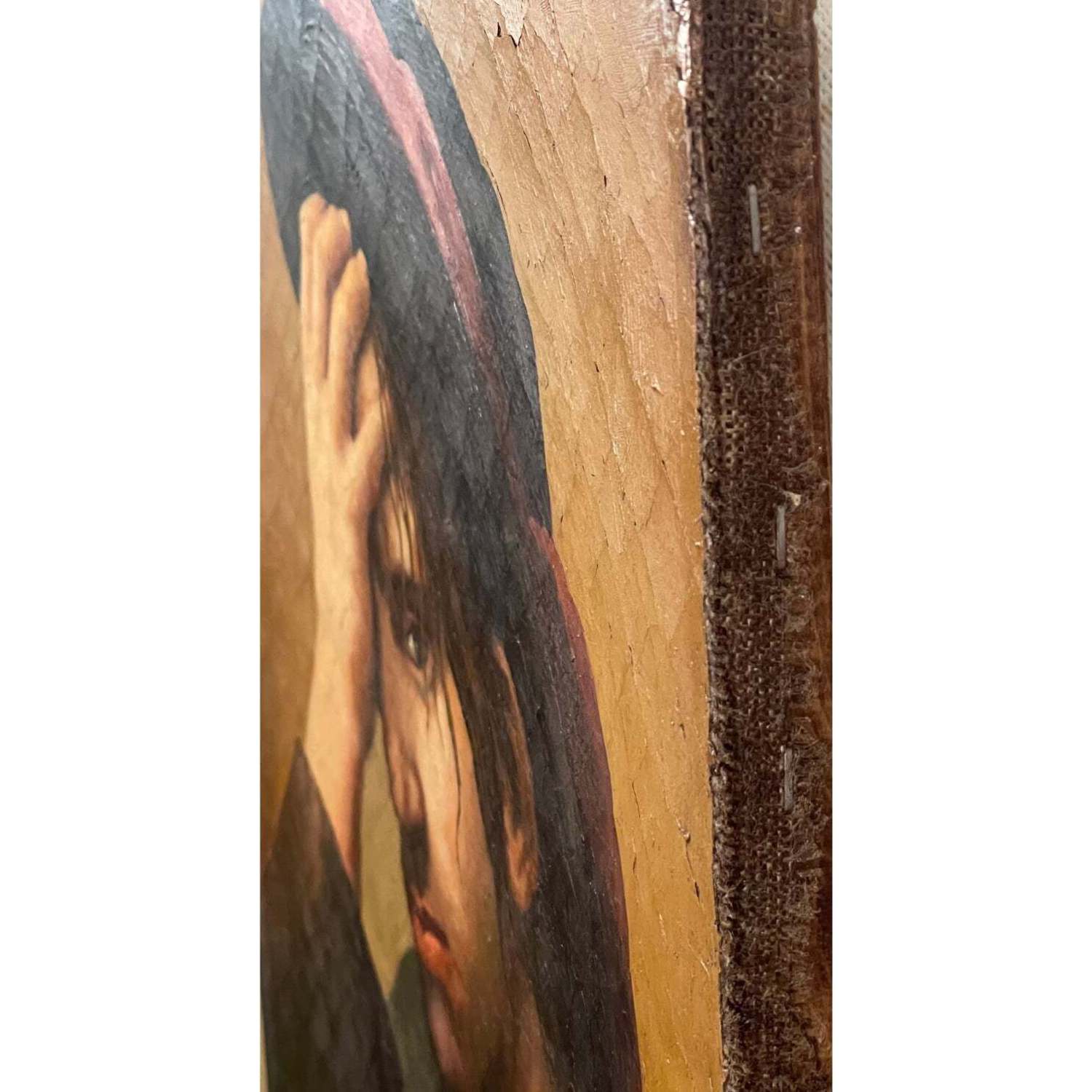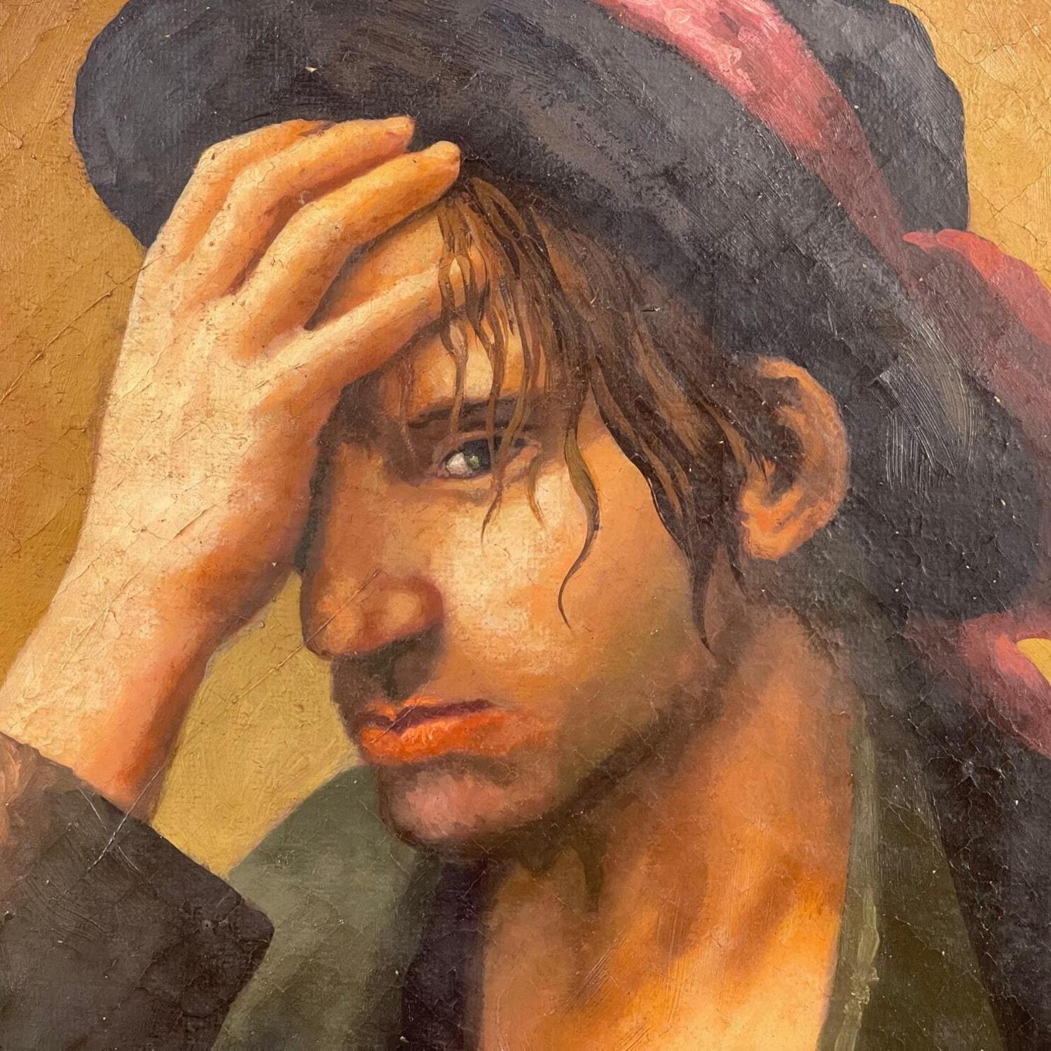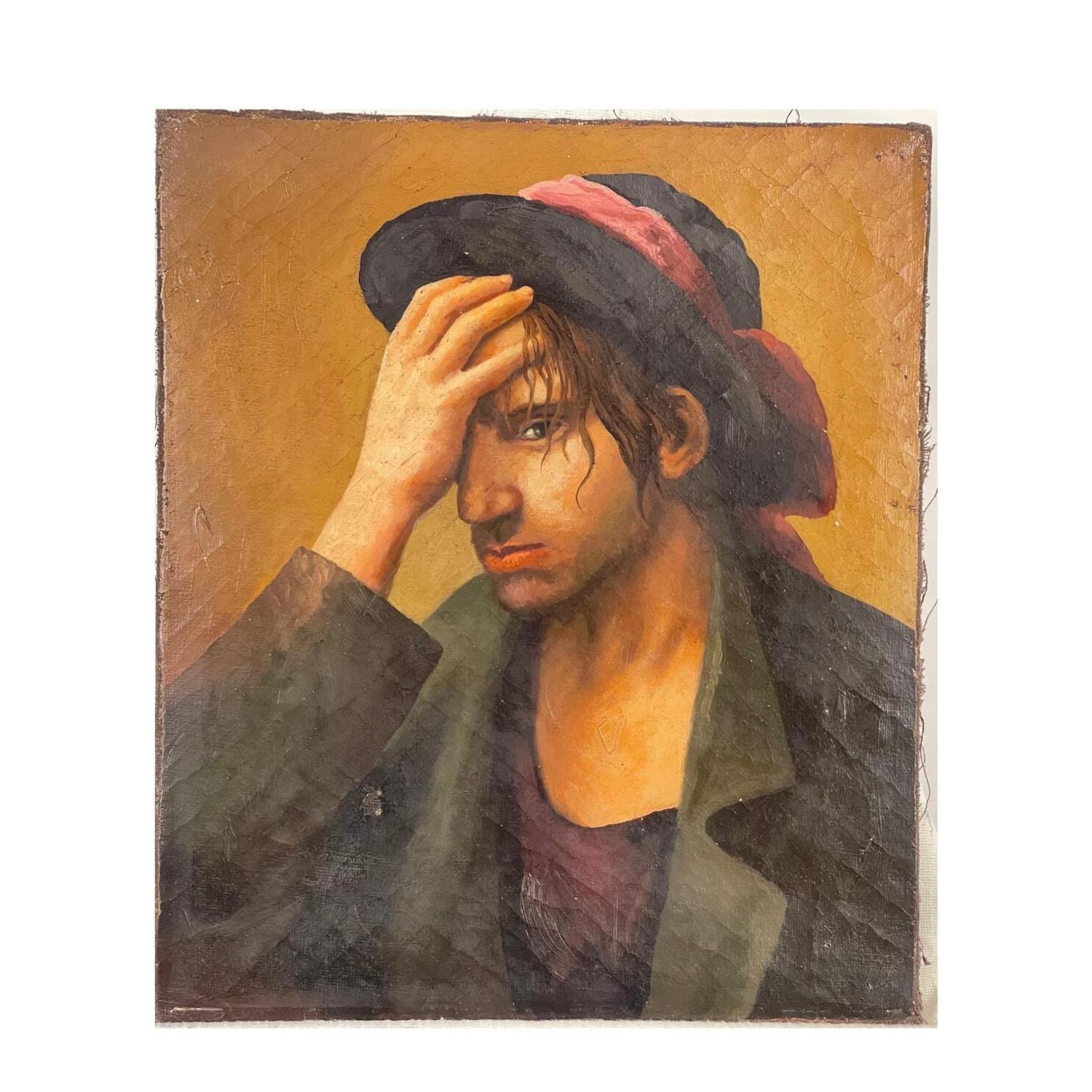Dipinto olio su tela Scuola Europea, raffigurante Ritratto di Uomo con cappello. Copia d'autore.