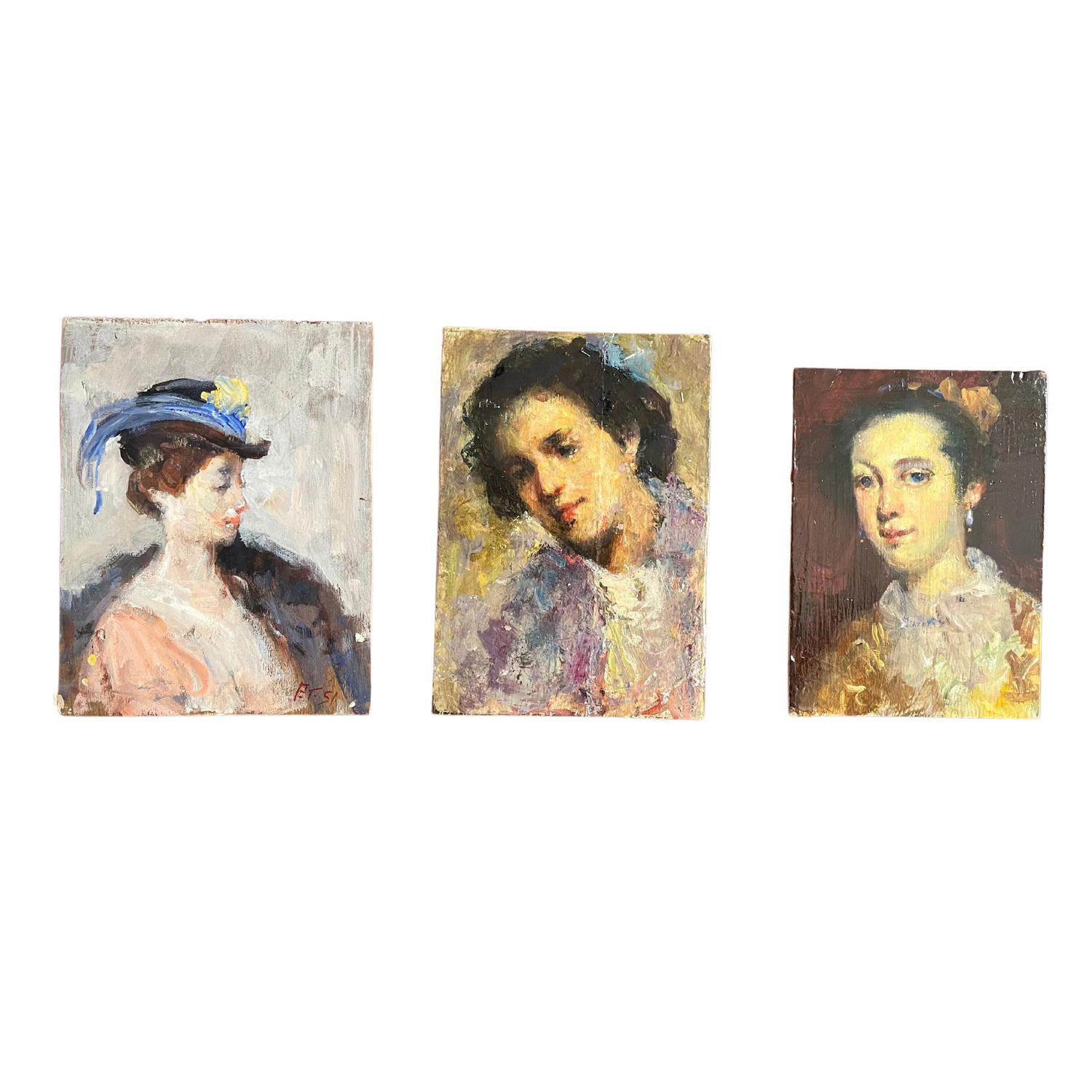 Lotto di tre piccoli dipinti olio su tavola, periodo XX secolo raffiguranti ritratti di donna.