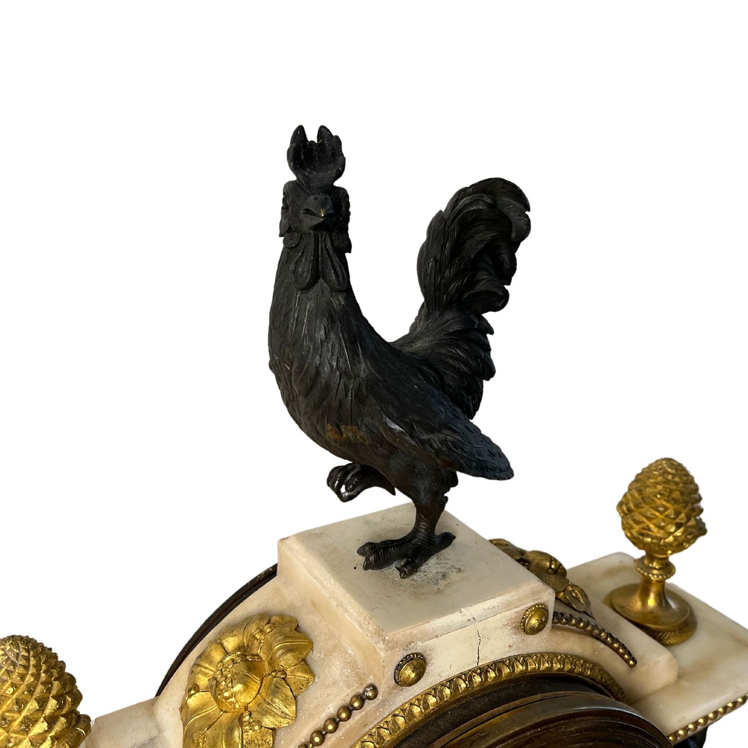 Importante orologio, periodo Luigi XVI in marmo bianco sorretto da due colonne, arricchito da bronzo dorato finemente cisellato.
