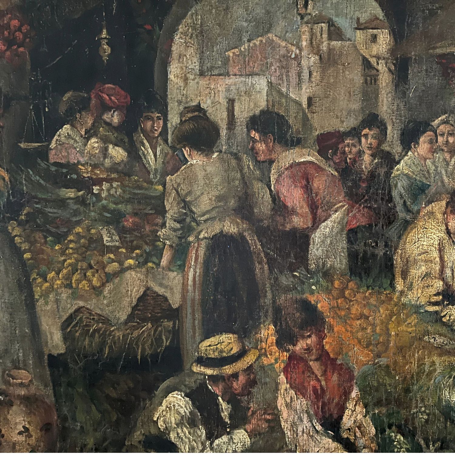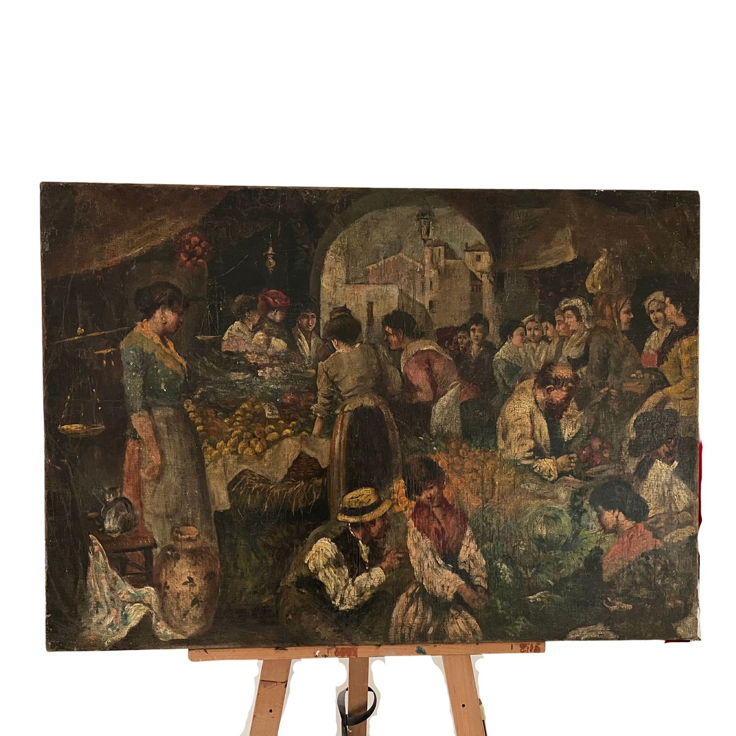 Dipinto olio su tela, periodo XX secolo raffigurante Scena di mercato. Recente rintelo.
