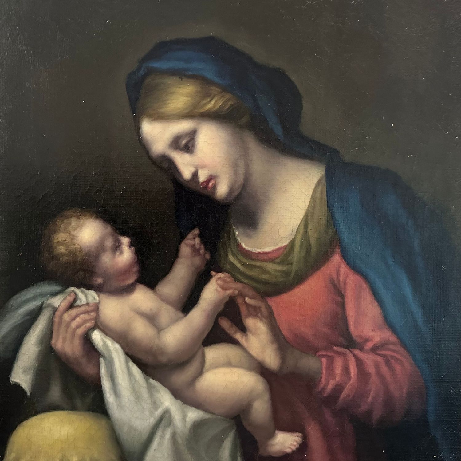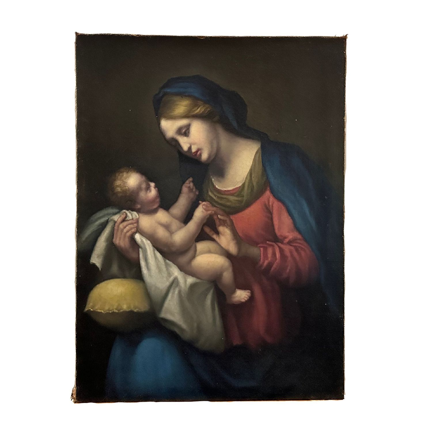 Dipinto olio su tela periodo XIX/XX secolo scuola Italiana raffigurante Vergine Maria e Gesù Bambino.