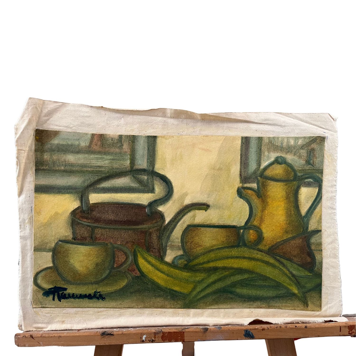 Dipinto olio su Cartoncino attaccato su tela, raffigurante Cocci e frutta