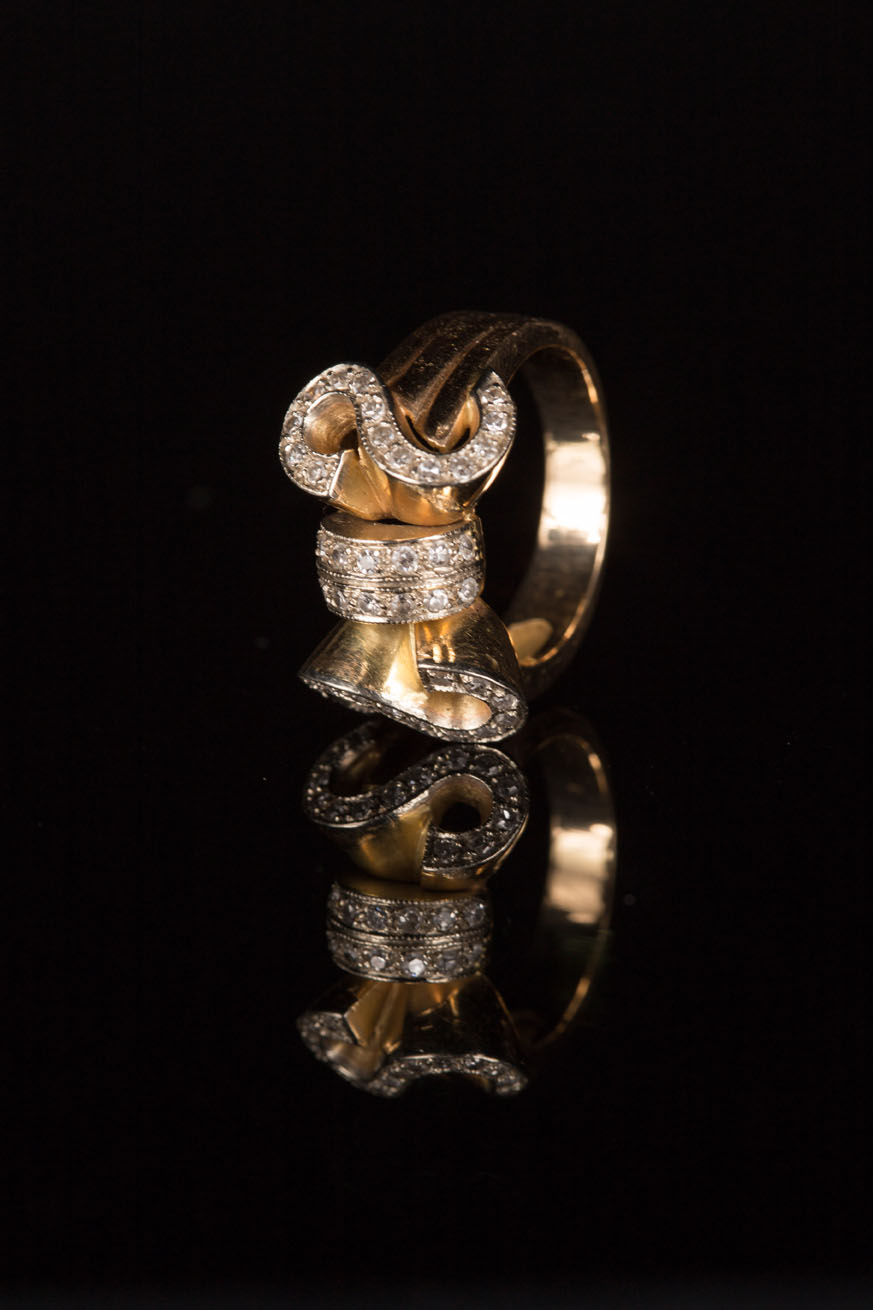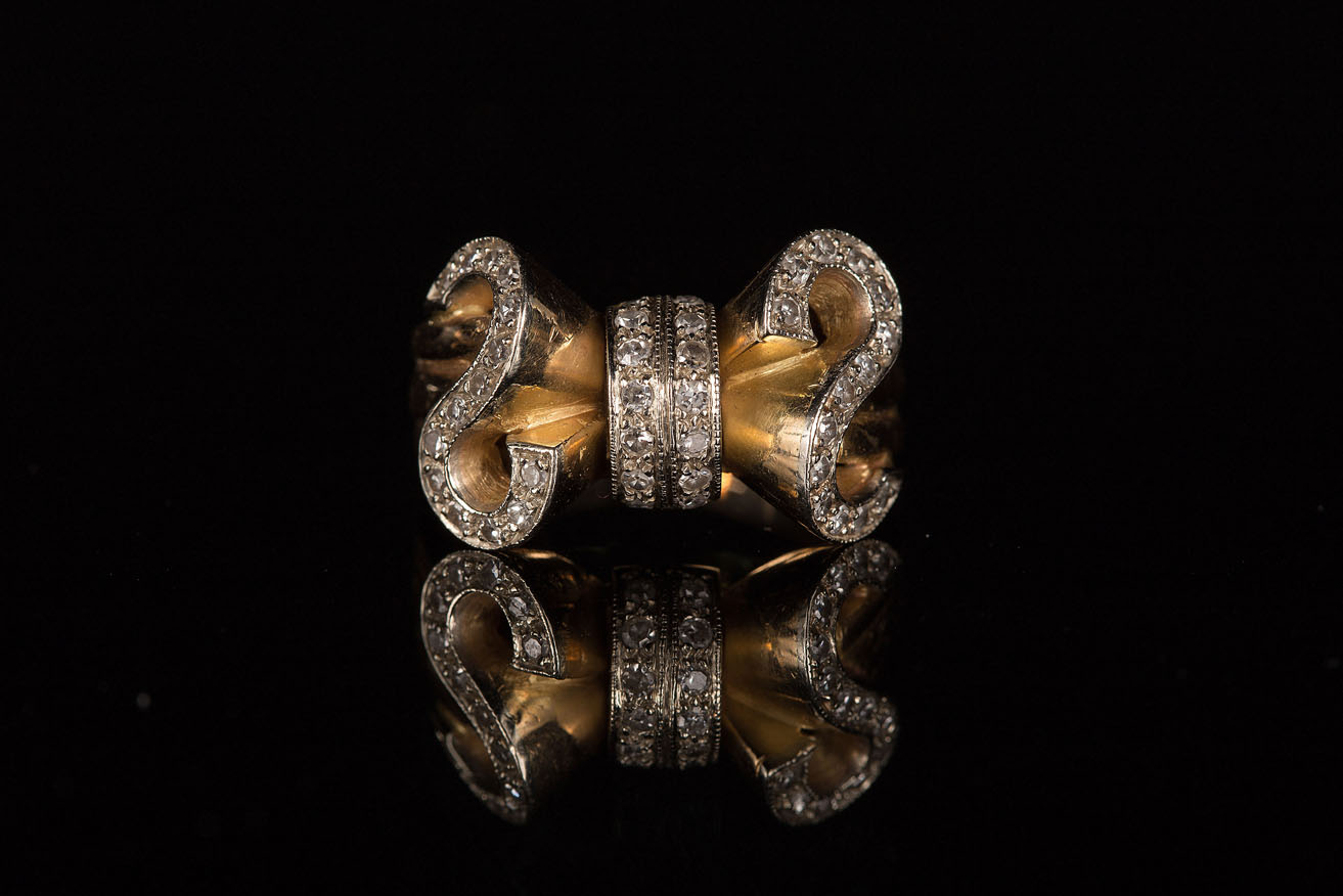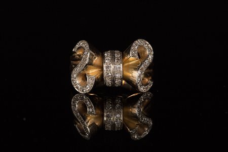 A 350 yellow gold ring, gr 11,20, with large central bow embellished with brilliants