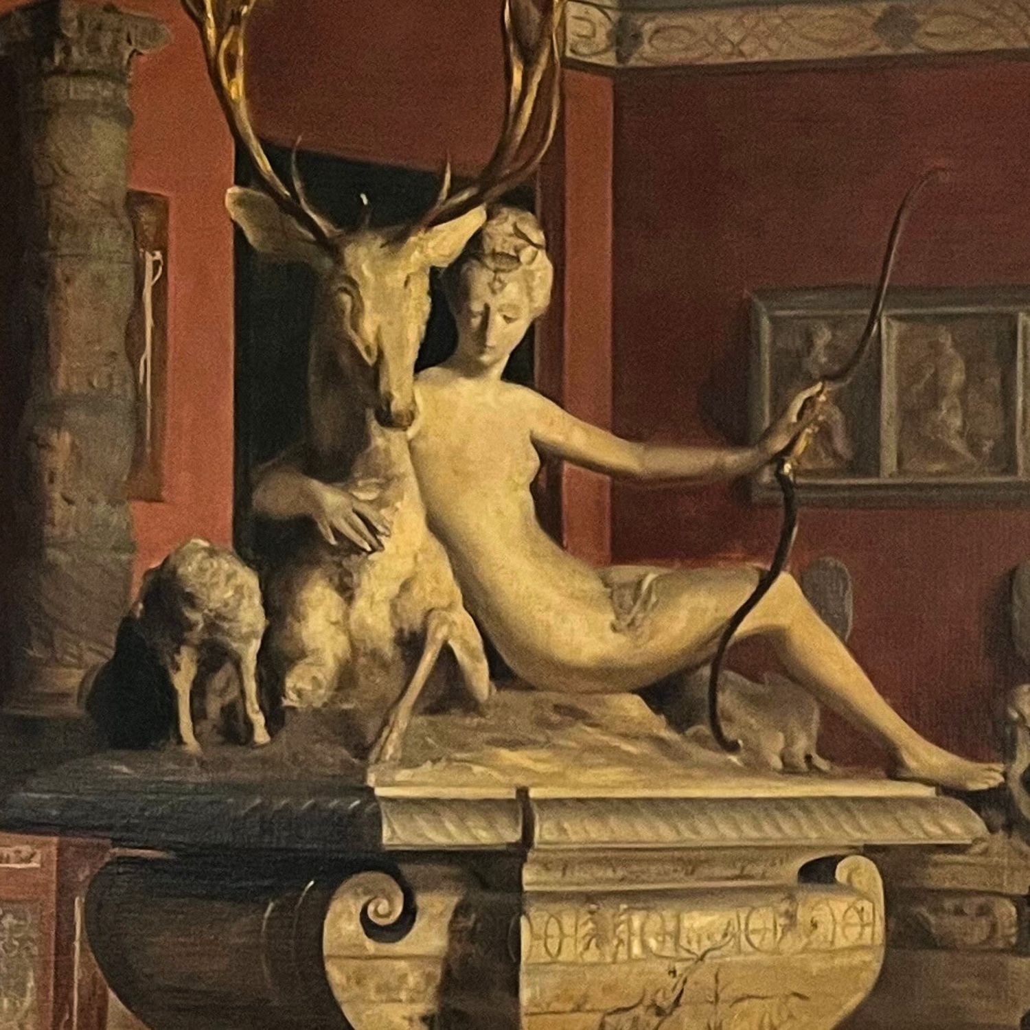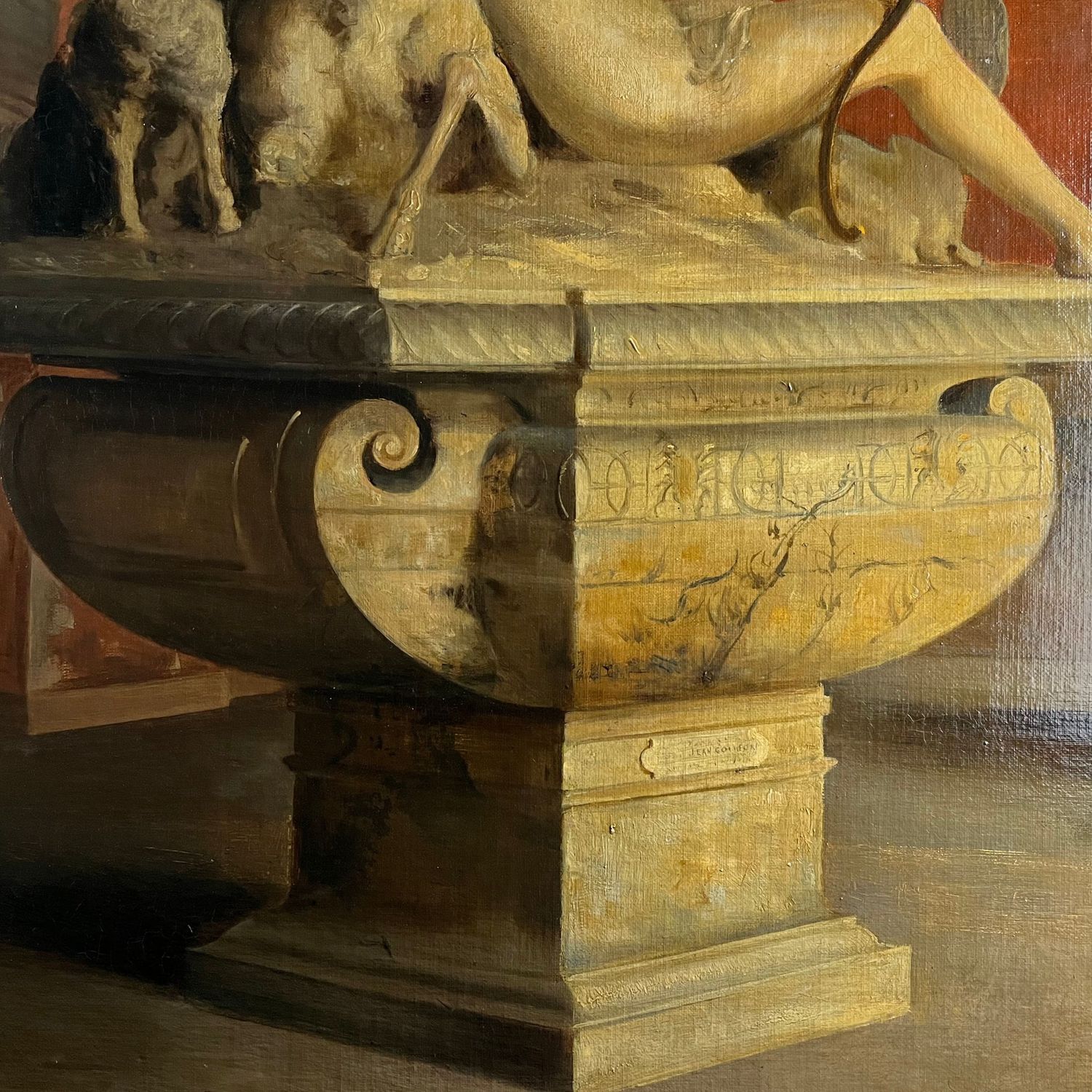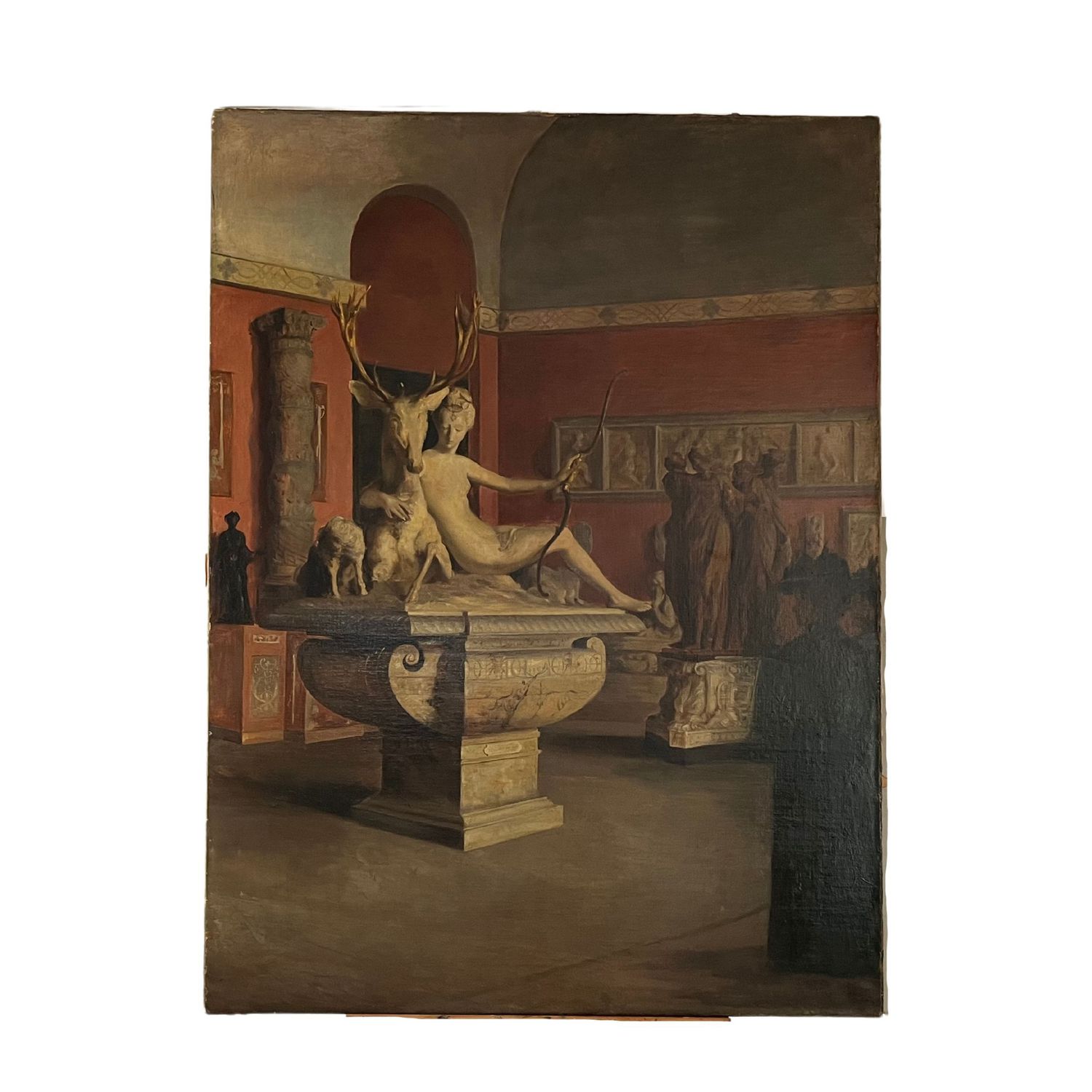 Dipinto olio su tela, Scuola Francese XIX secolo. Raffigurante Visita al museo Louvre di Parigi (Rintelo XX secolo). Piccoli punti di restauro. 97x131 cm.