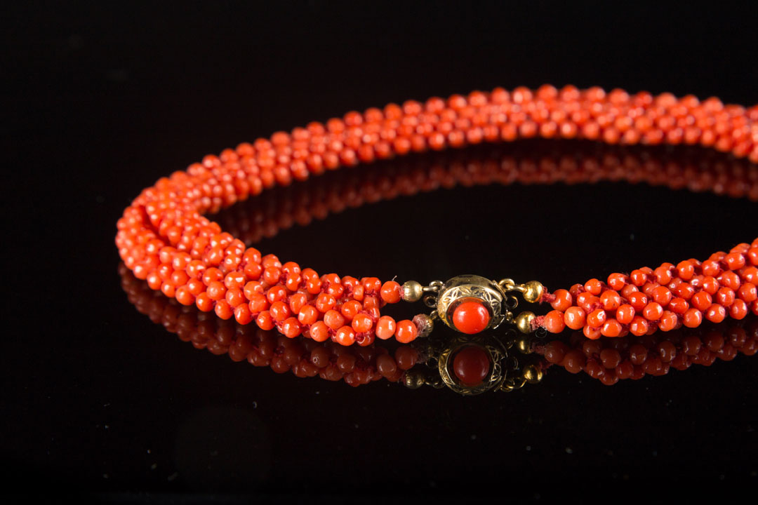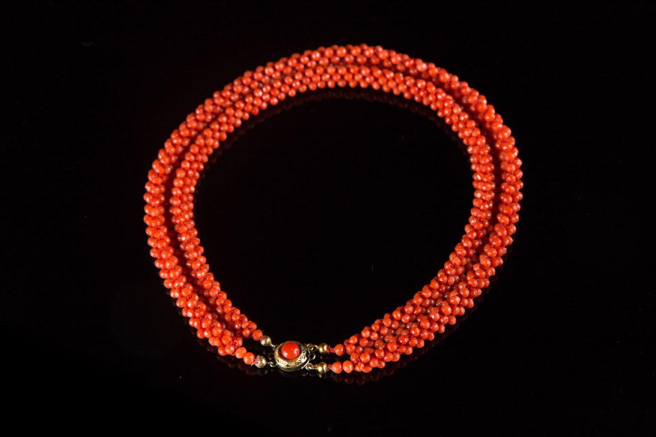 A necklace made up of a string of small coral beads, gilt silver clasp (800).