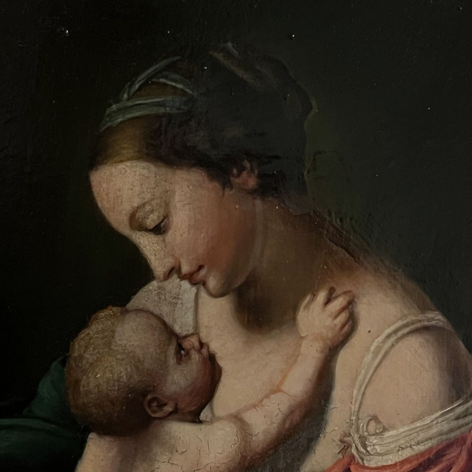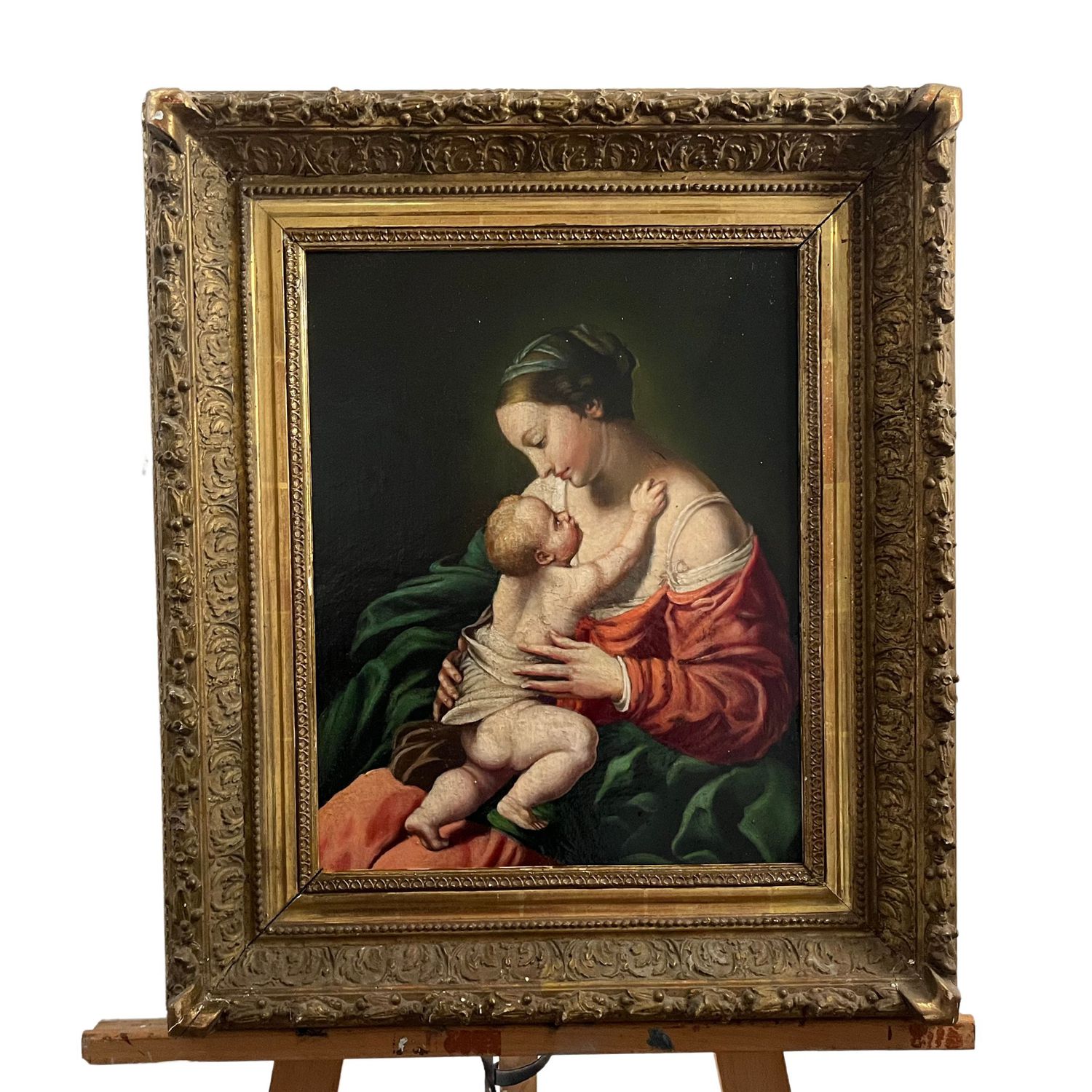 Dipinto olio su tela, raffigurante Vergine e Bambino, XX° secolo. Scuola italiana, artista anonimo.