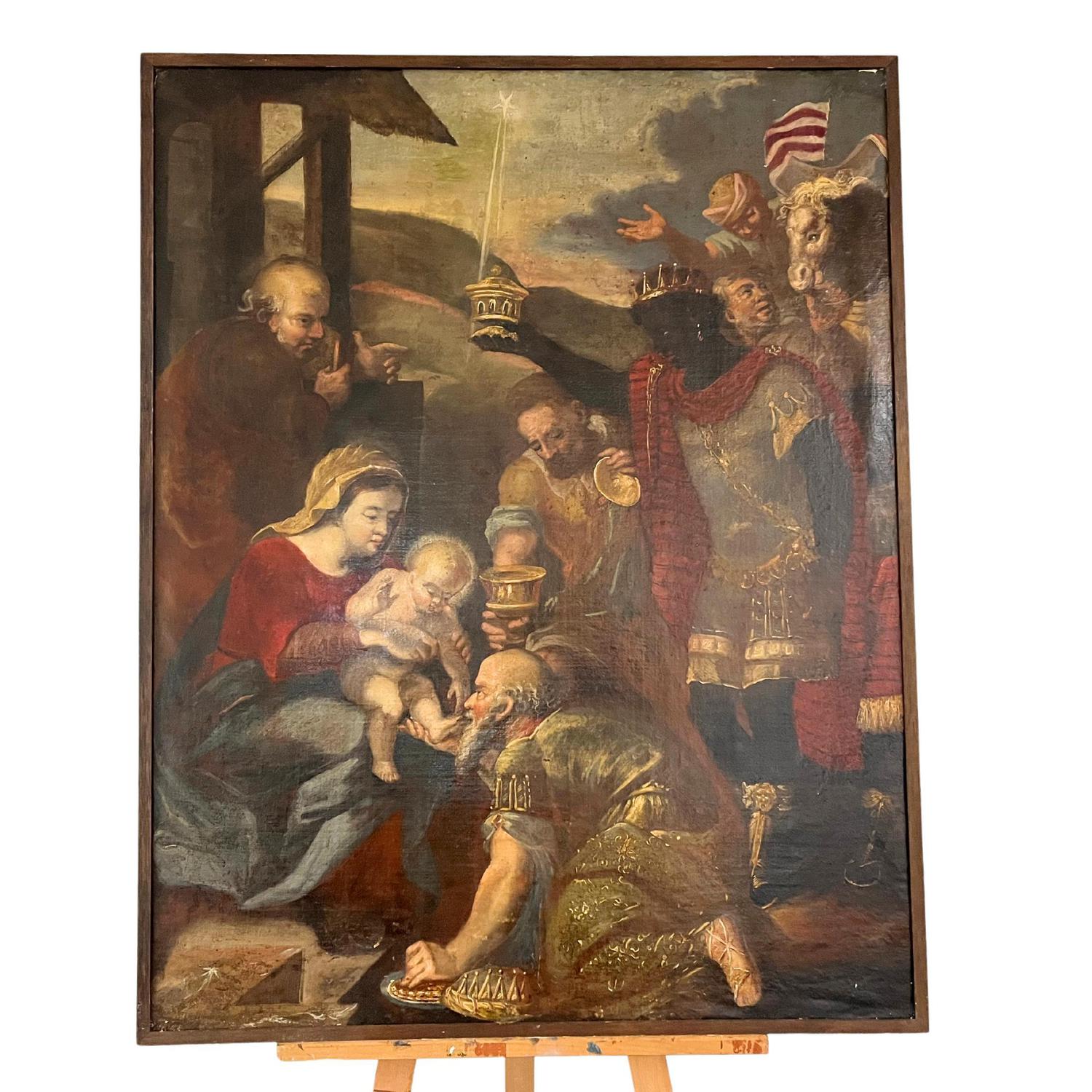 Dipinto olio su tela, raffigurante l'adorazione dei Re Magi, XIX secolo.