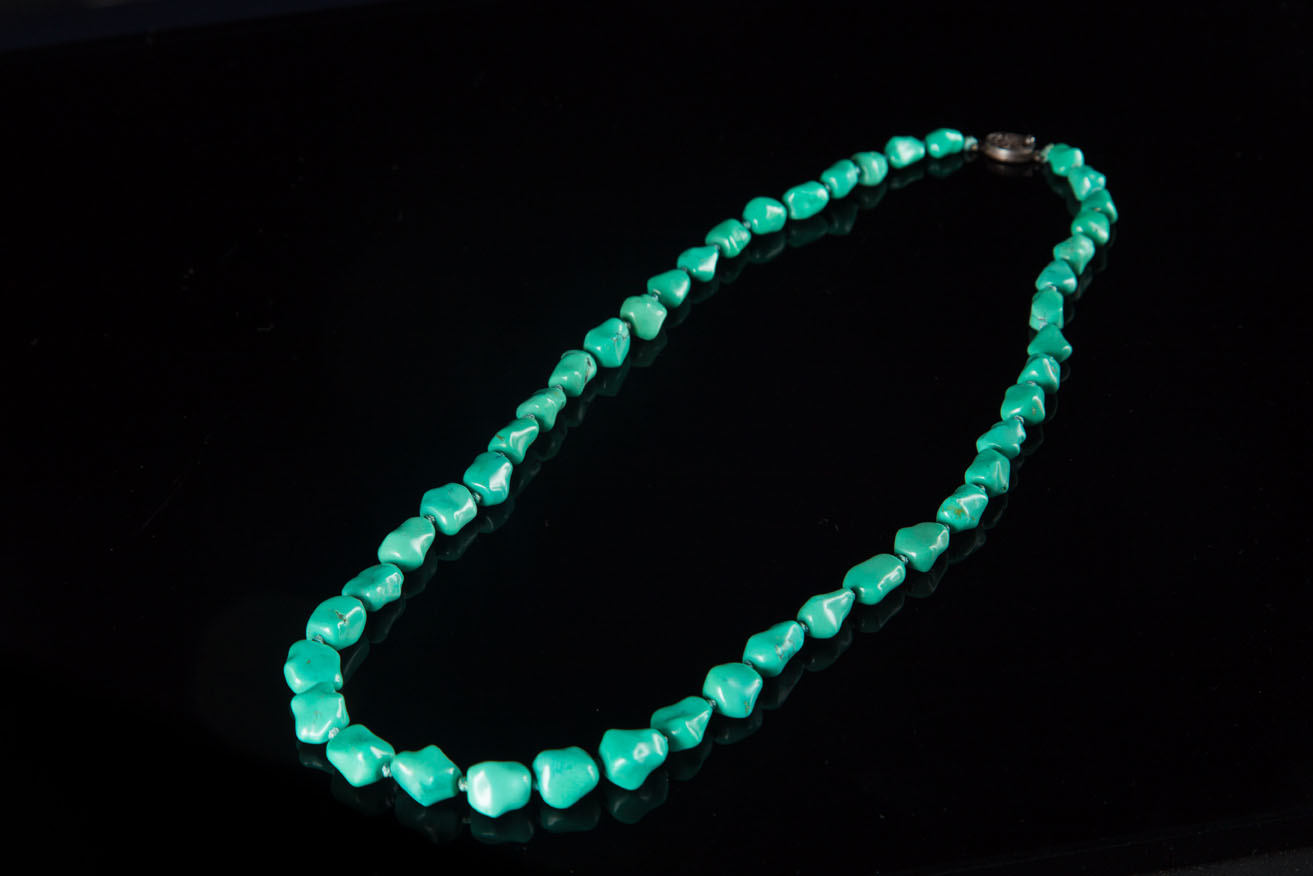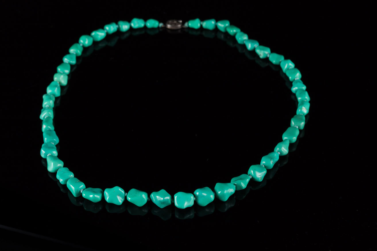 A dégradé turquoise necklace graduated from the smallest to the largest set in the centre of the necklace. Small worked silver clasp.