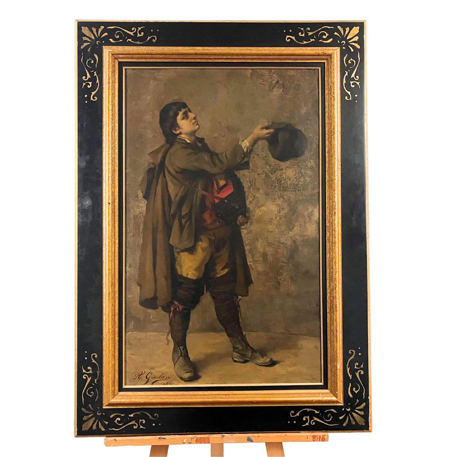 Dipinto olio su tela, Scuola Francese, XX secolo, raffigurante Artista di strada. Firmato in basso a sinista A. Goutier 1986