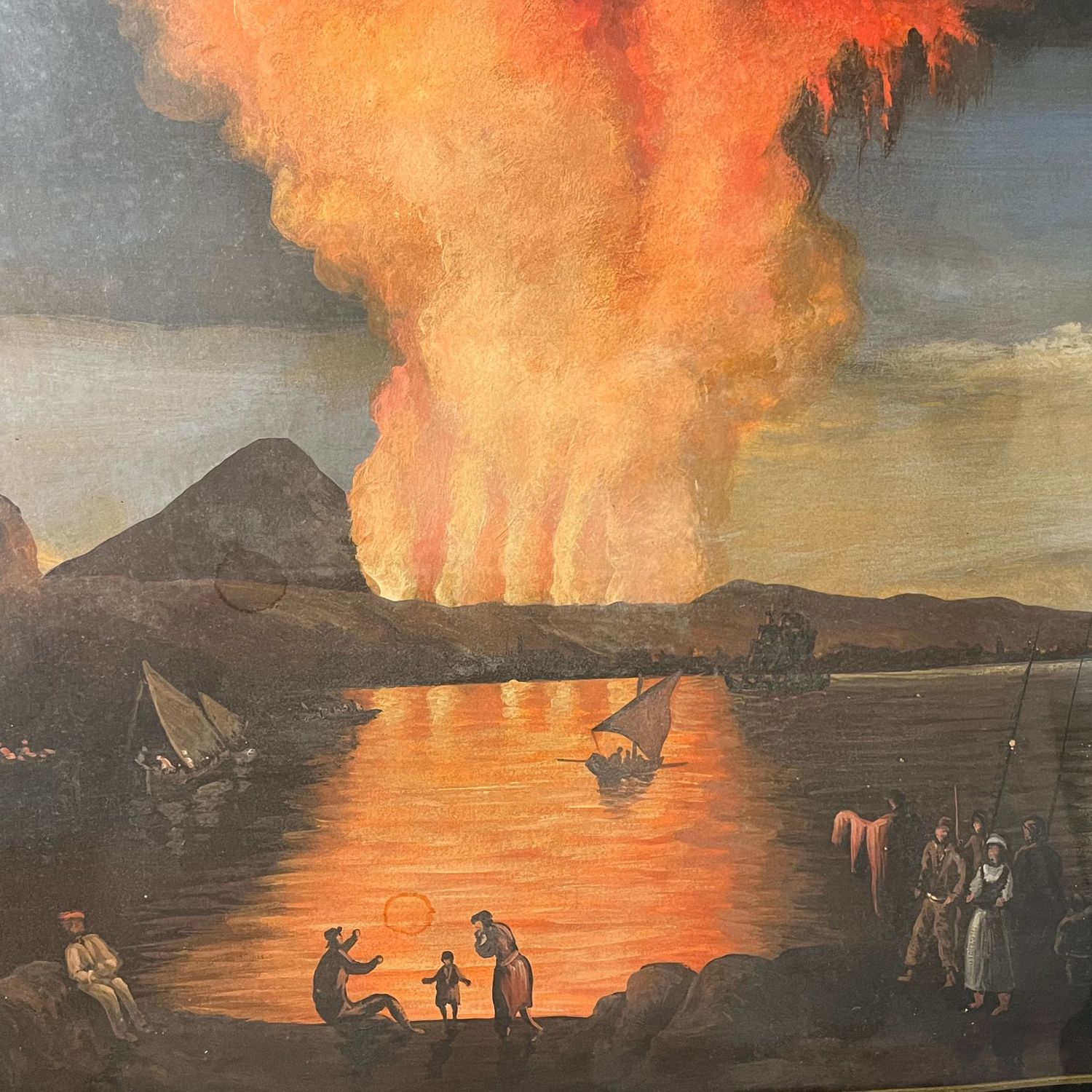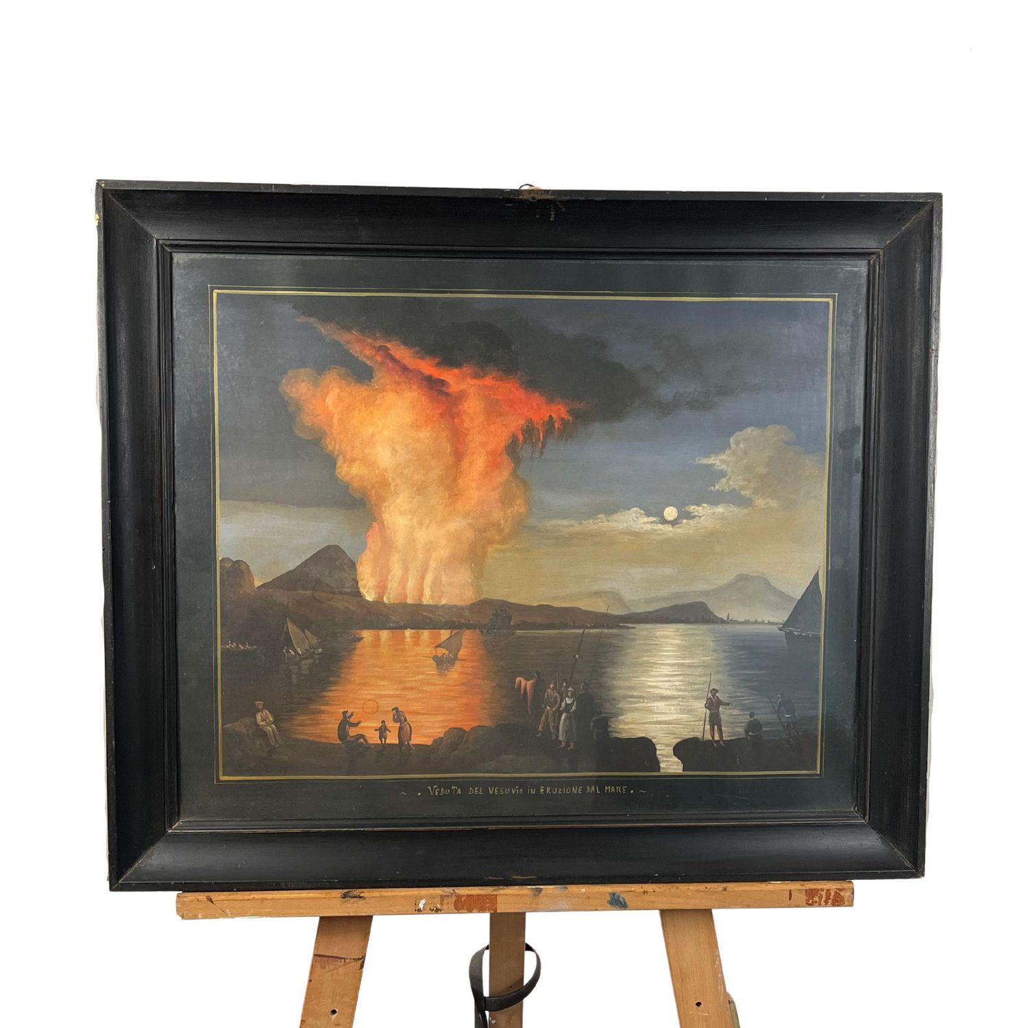 Dipinto guazzo (tempera su carta), periodo XX secolo, scuola Napoletana raffigurante Eruzione del Vesuvio vista dal mare.