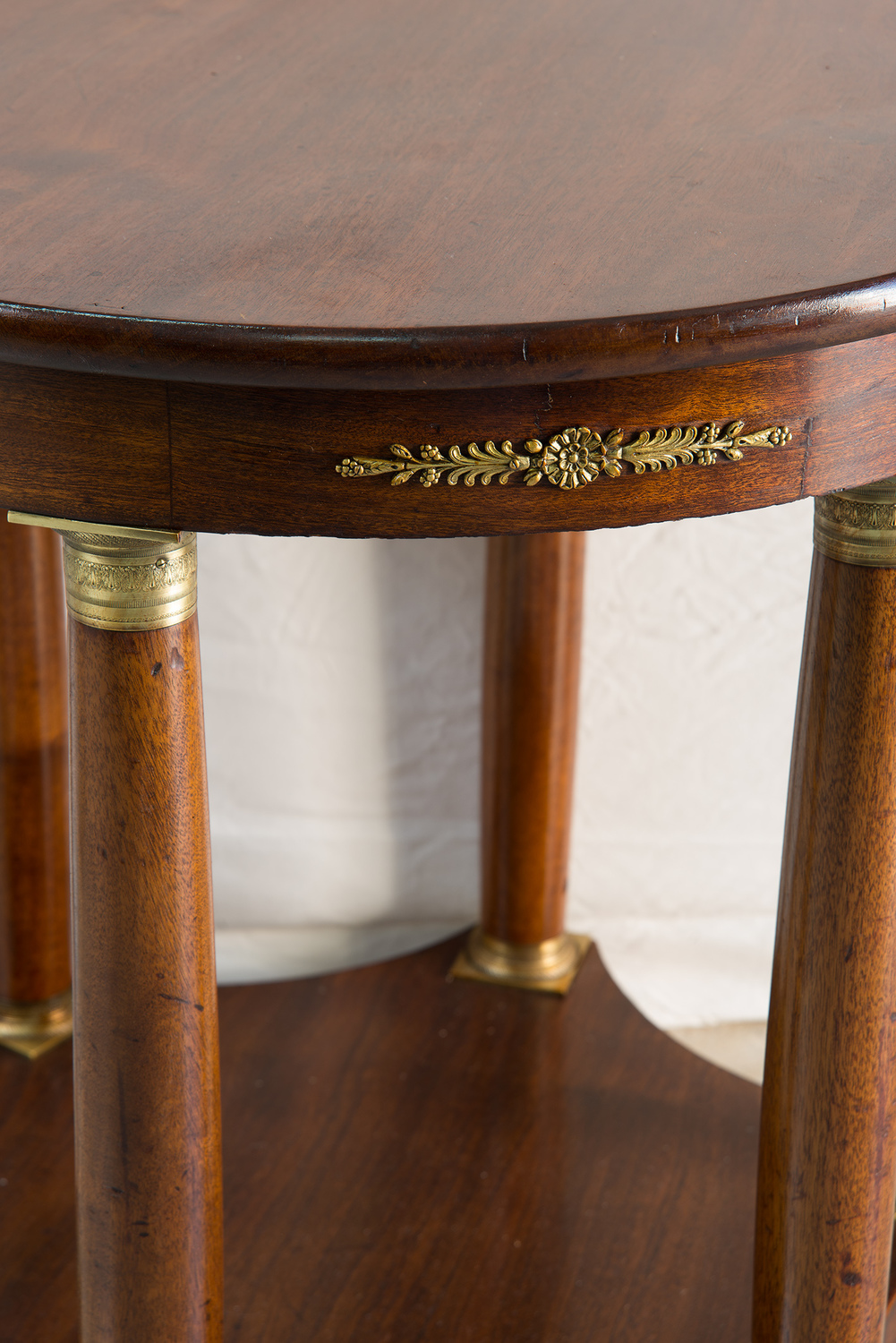 Tavolino antico Impero Francese in mogano con innesti di elementi in bronzo dorato finemente cesellato.
