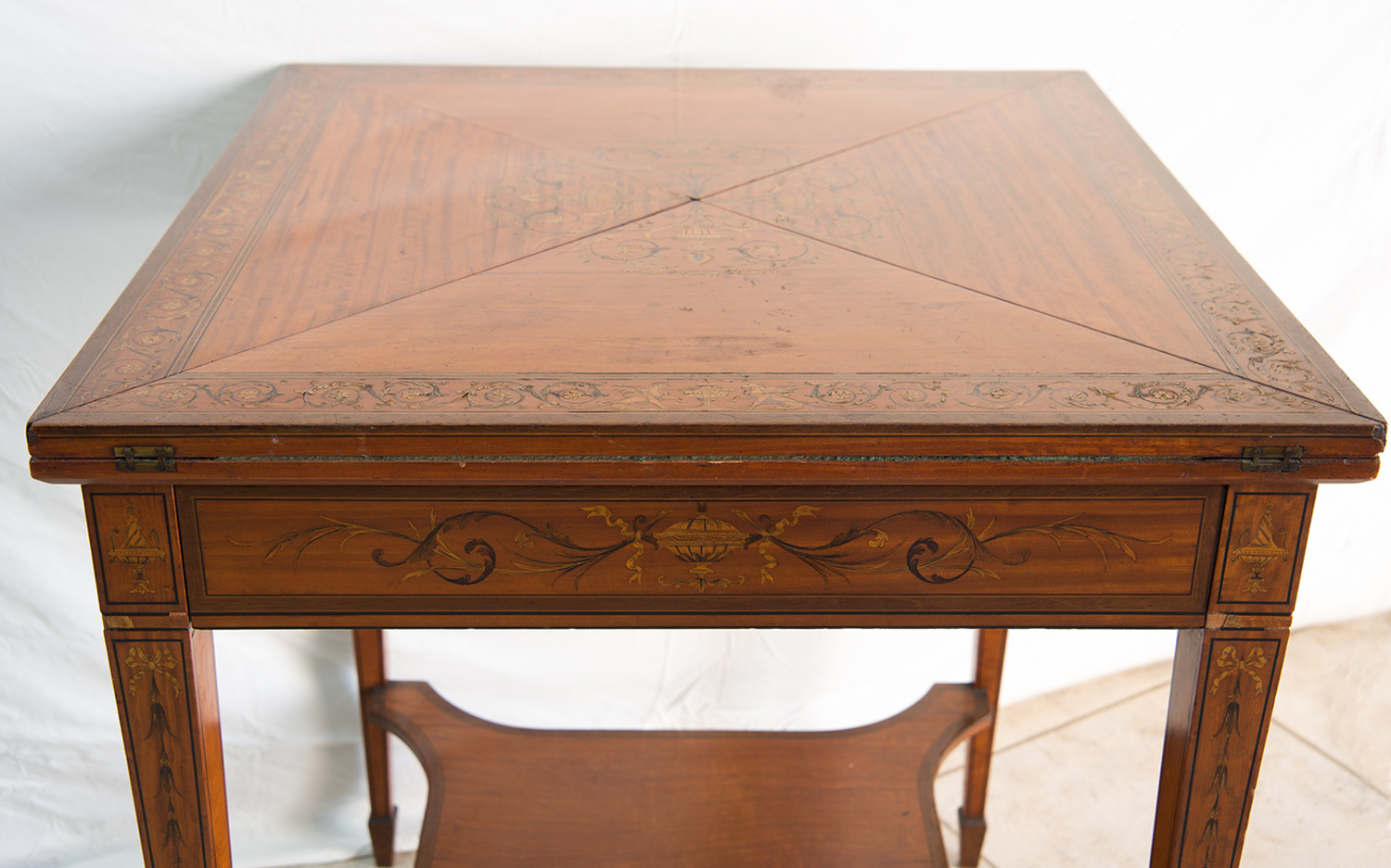 Tavolino da gioco a fazzoletto Eduardiano Inglese in Satinwood appartenente alla seconda metà del XIX secolo.
