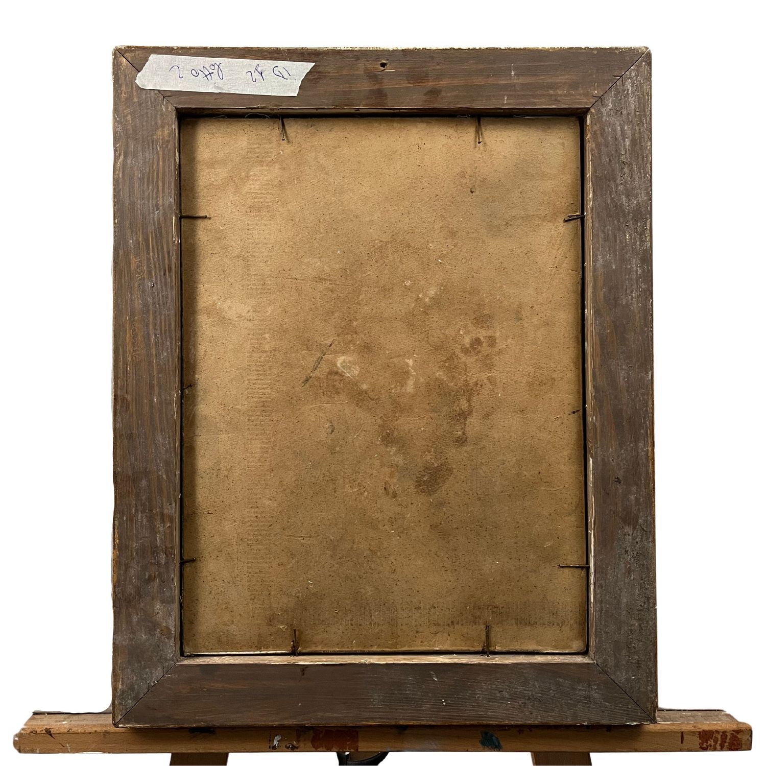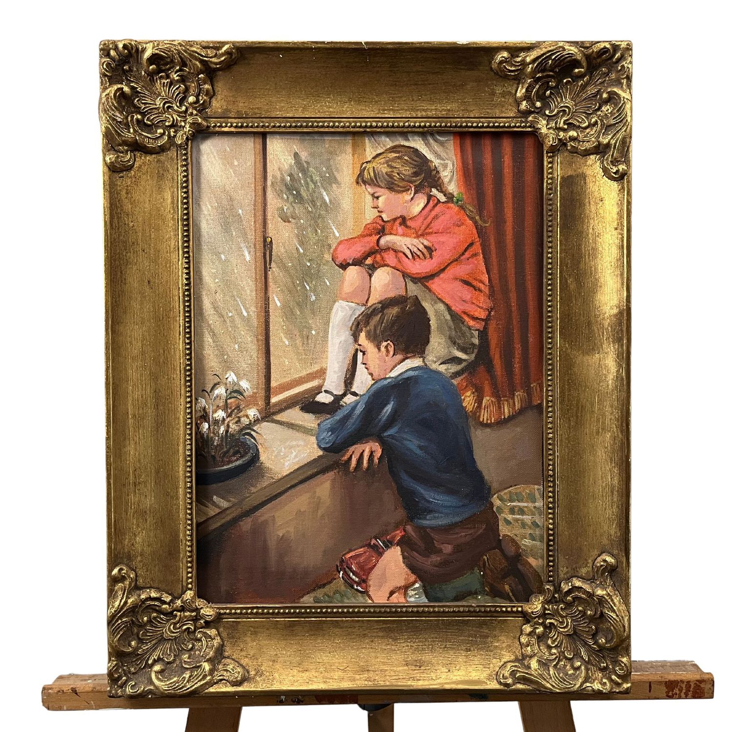 Dipinto olio su tela applicato su cartoncino, Scuola continentale raffigurante Bambini alla finestra, XX secolo. Copia d'autore
