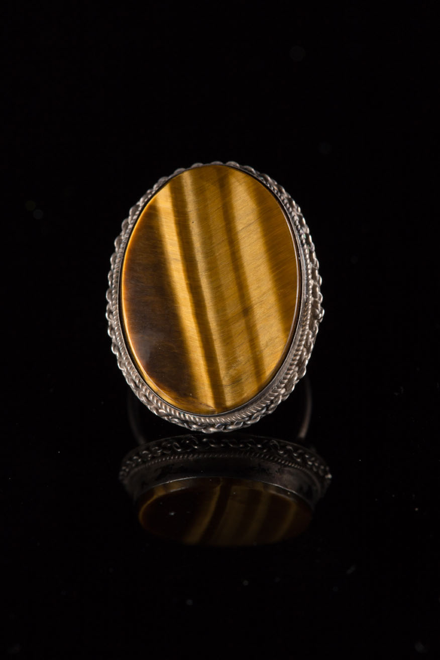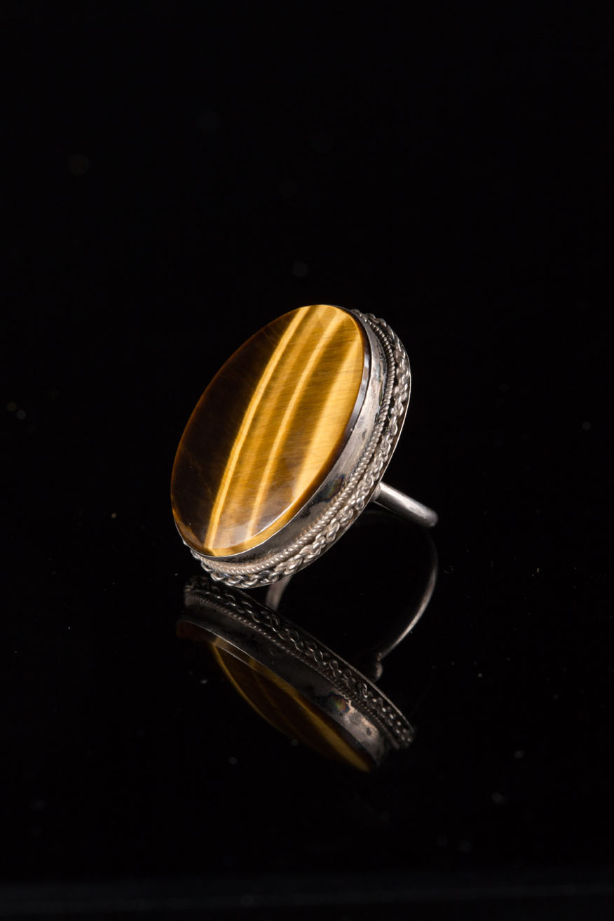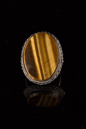 A worked silver ring (800) set with a bright 'tiger's eye', a splendid quartz that produces the characteristic yellow reflections that make this crystal seem like a tiger's eyes.
