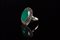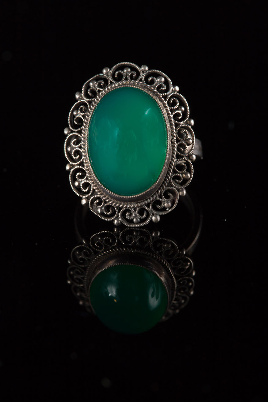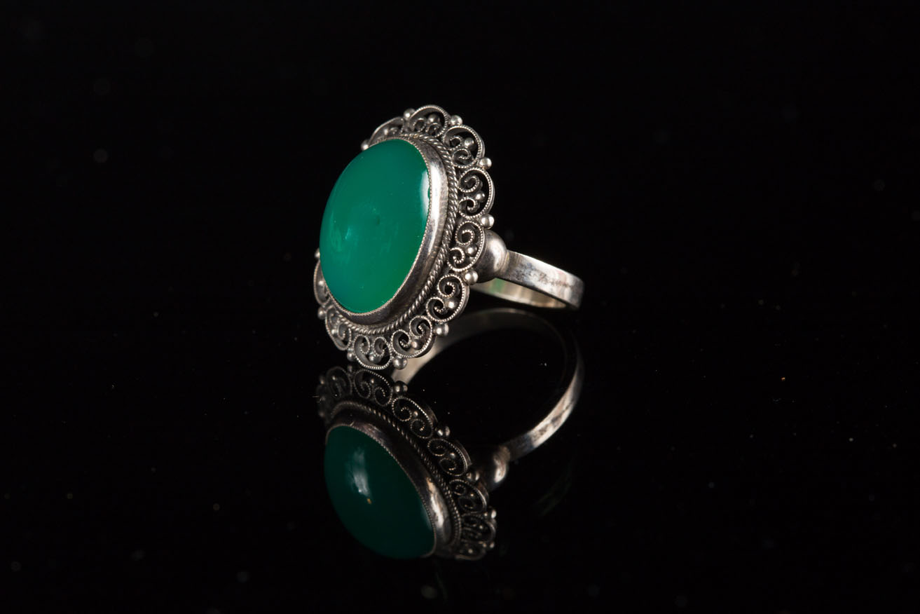 A filigree silver ring (800),set with a cabochon cut, intense green colour chrysoprase.