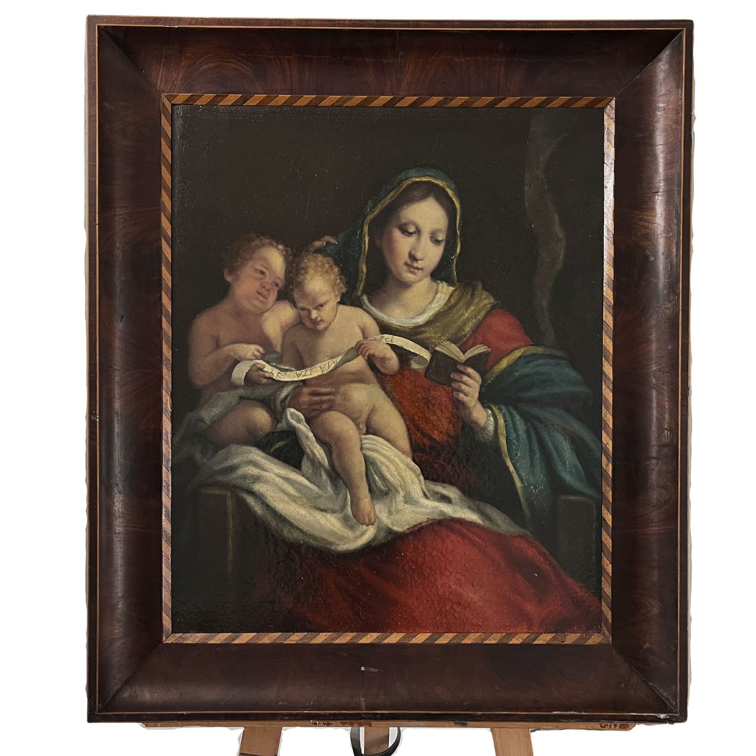 Dipinto olio su tela, raffigurante Vergine Maria, Gesù Bambino e San Giovanino. Scuola Italiana XIX/XX secolo.