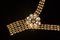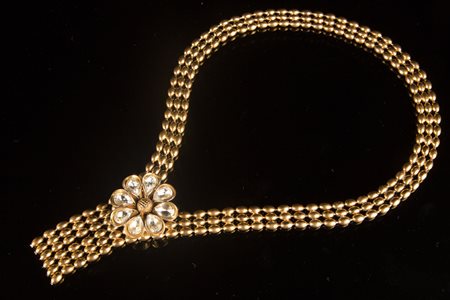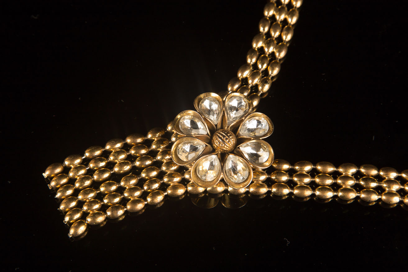 A long gilt necklace with central rosette, petals are adorned with crystal drops.