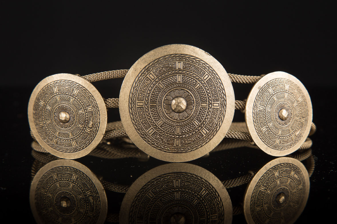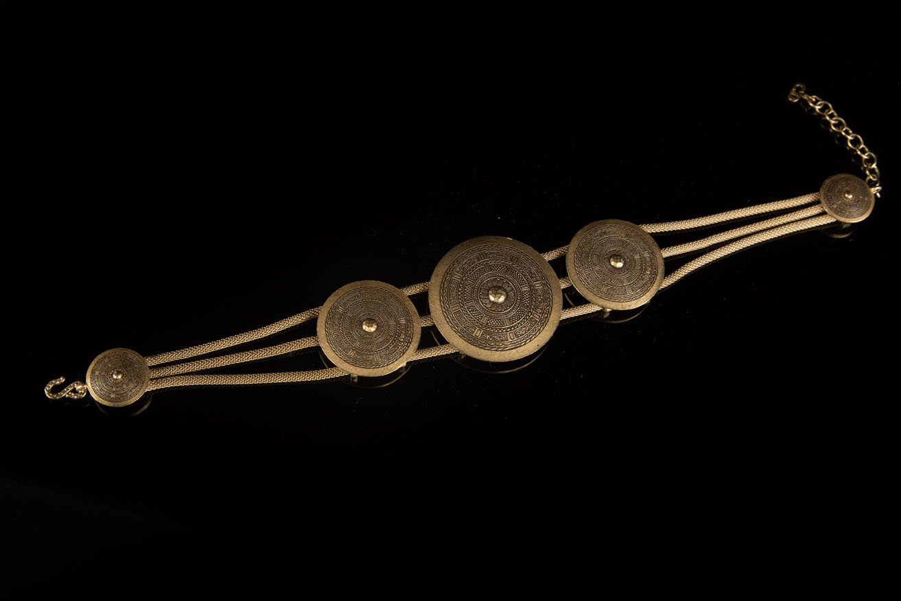 A browned gilt metal necklace of ethnic style composed of large engraved medals.