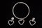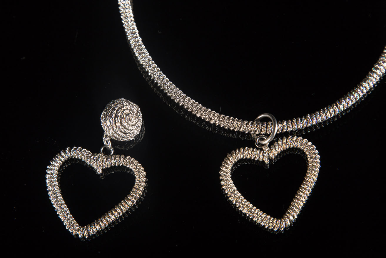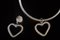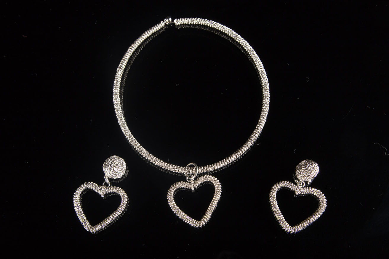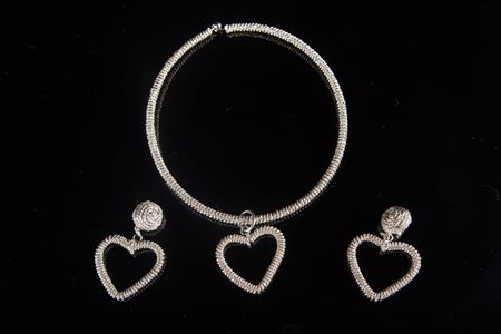 Demi-parure made up of a rigid necklace and earrings, silver-plated with large heart-shaped pendants, symbol of the famous Italian brand.