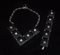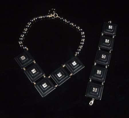 Demi-parure comprising a black plastic necklace and bracelet, made up of many squares with a central white rhinestone that illuminates them.