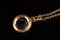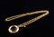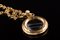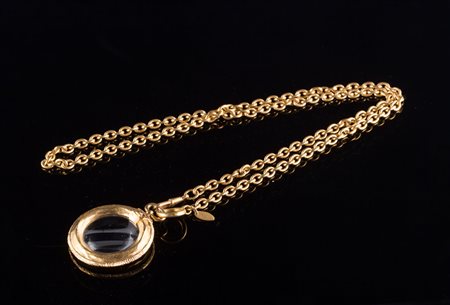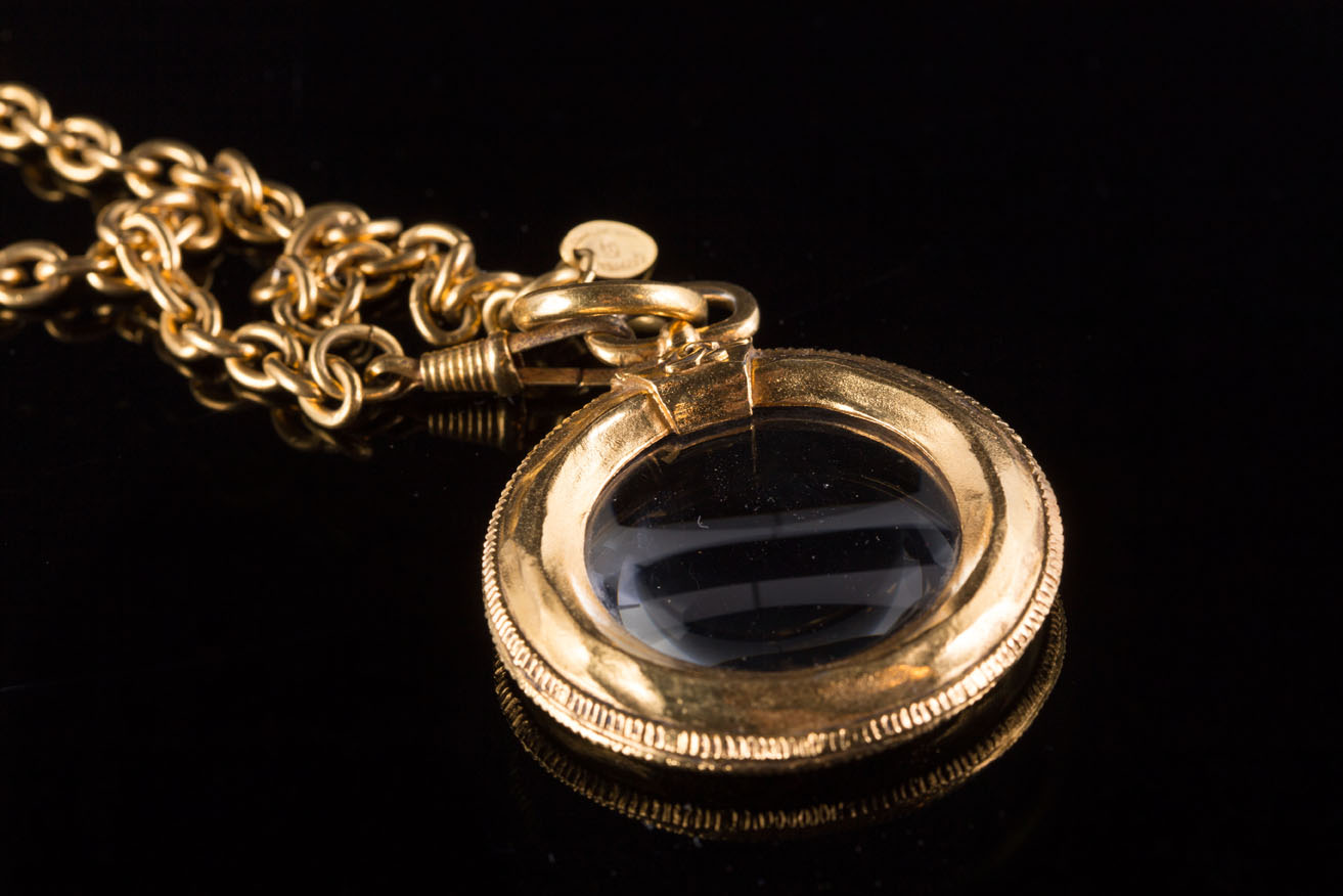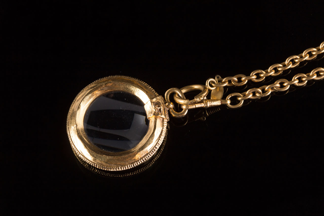 A necklace made up of a long gilt chain and a magnifying glass pendant.