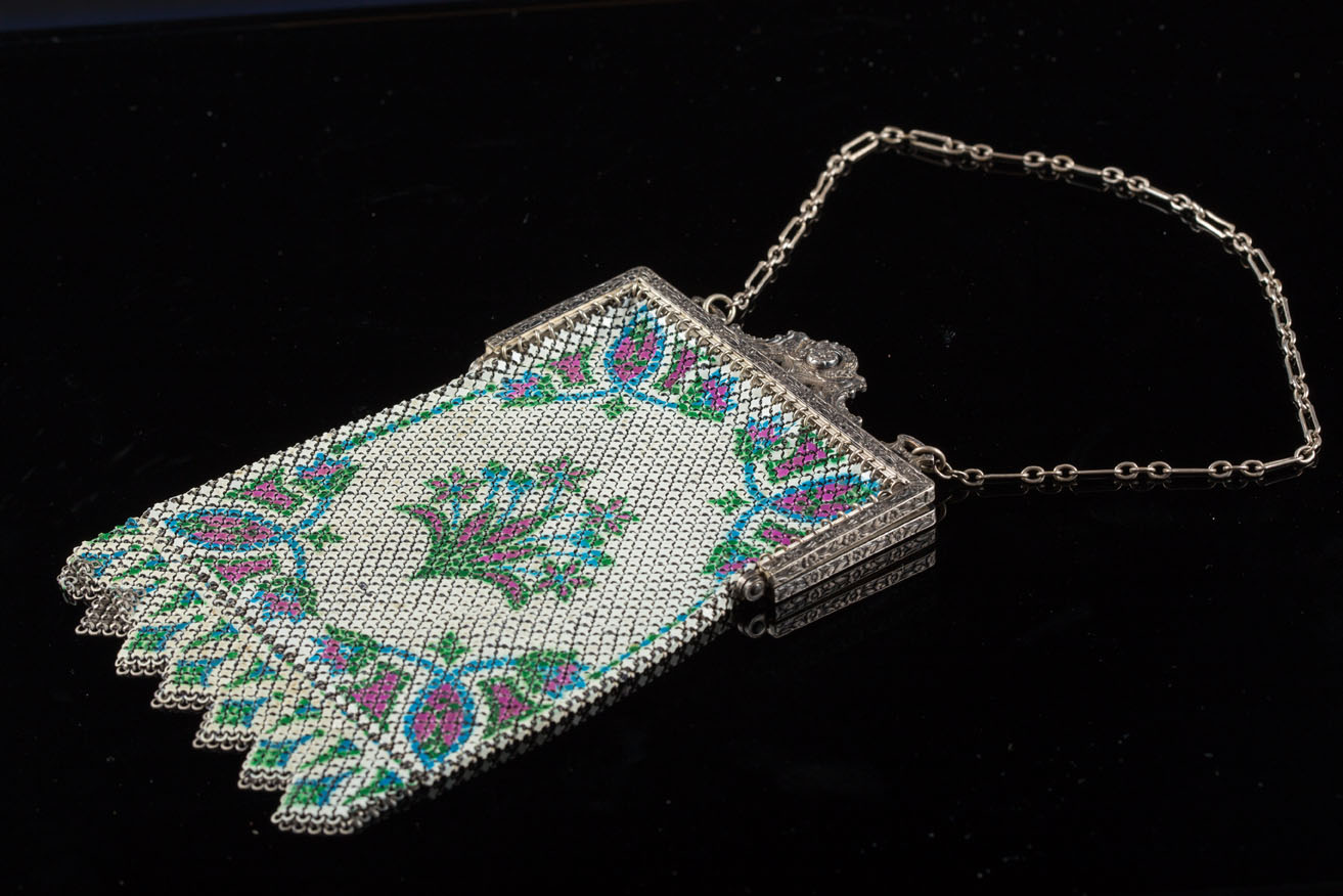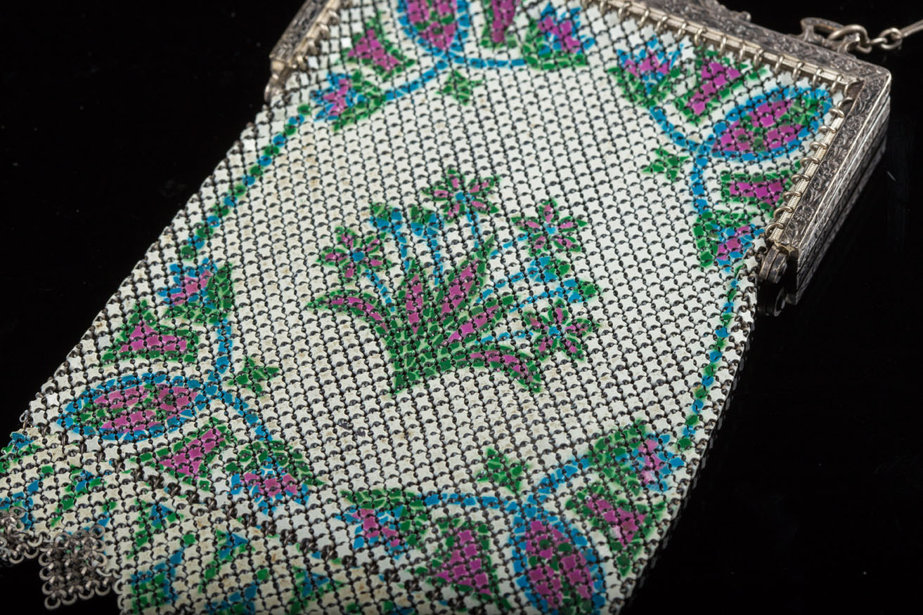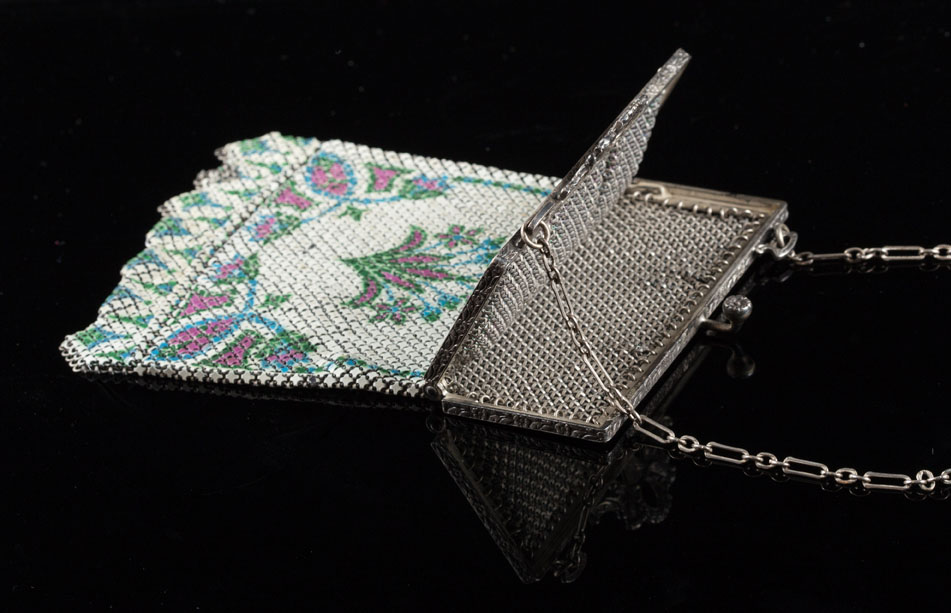 An elegant object dating to the 1920’s, that carries the name of one of the most famous producers of metallic mesh purse handbags; with a floral pattern in Victorian style. An additional aspect that heightens this objects, making it all the more unique, is the famous "7-point Van Dyke", that being the metal mesh fringe that decorates the bottom edge.