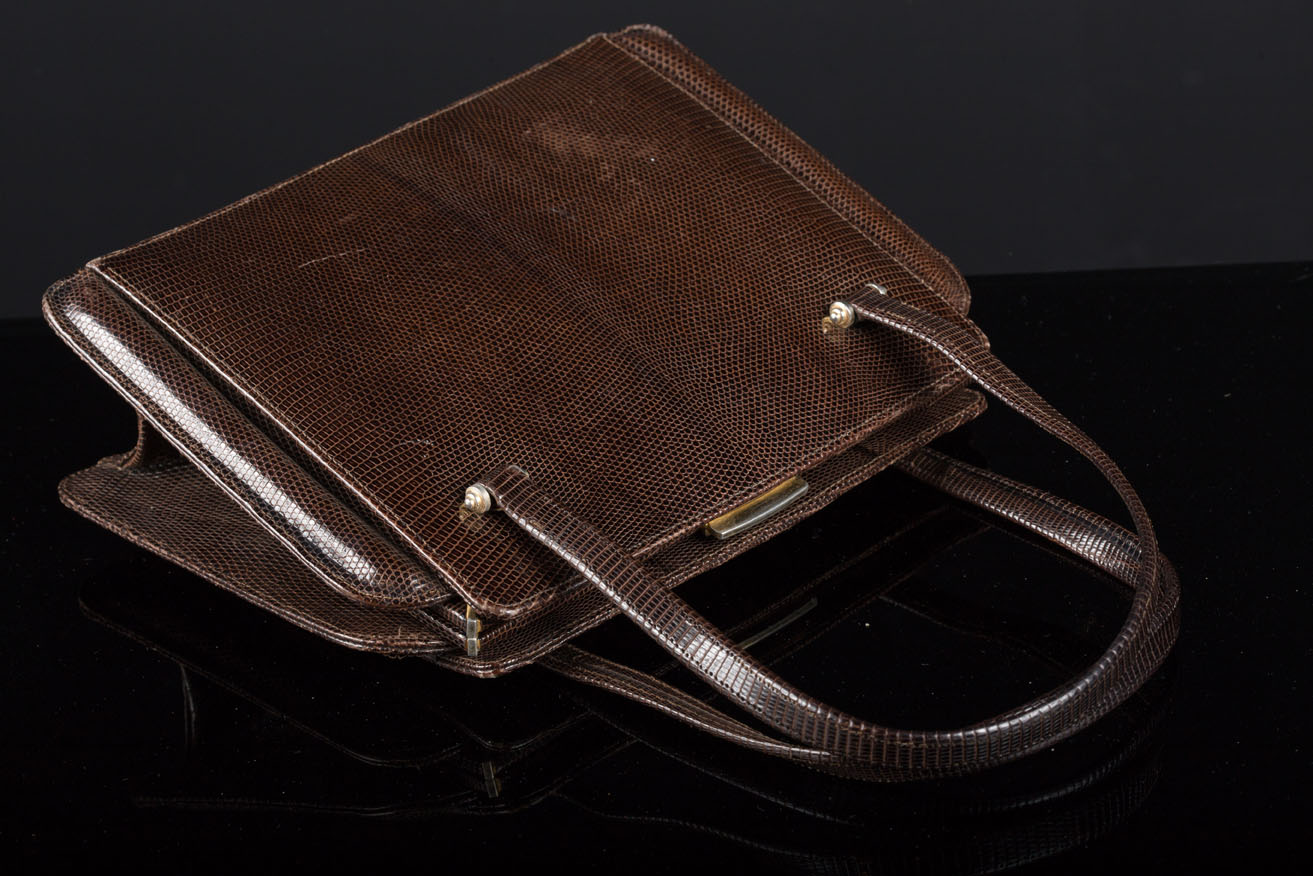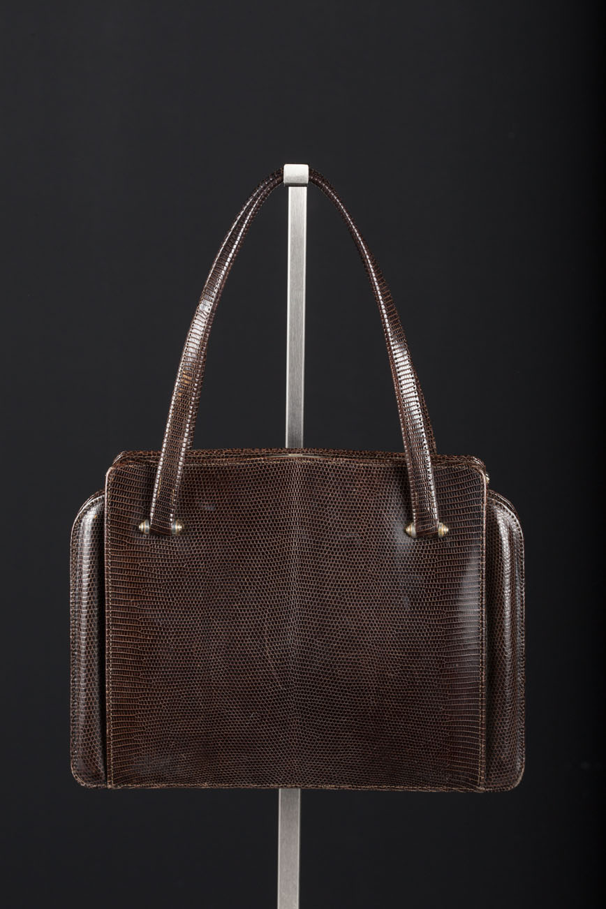 A handmade bag 1950'sA small brown lizard-skin bag with clip closure....
