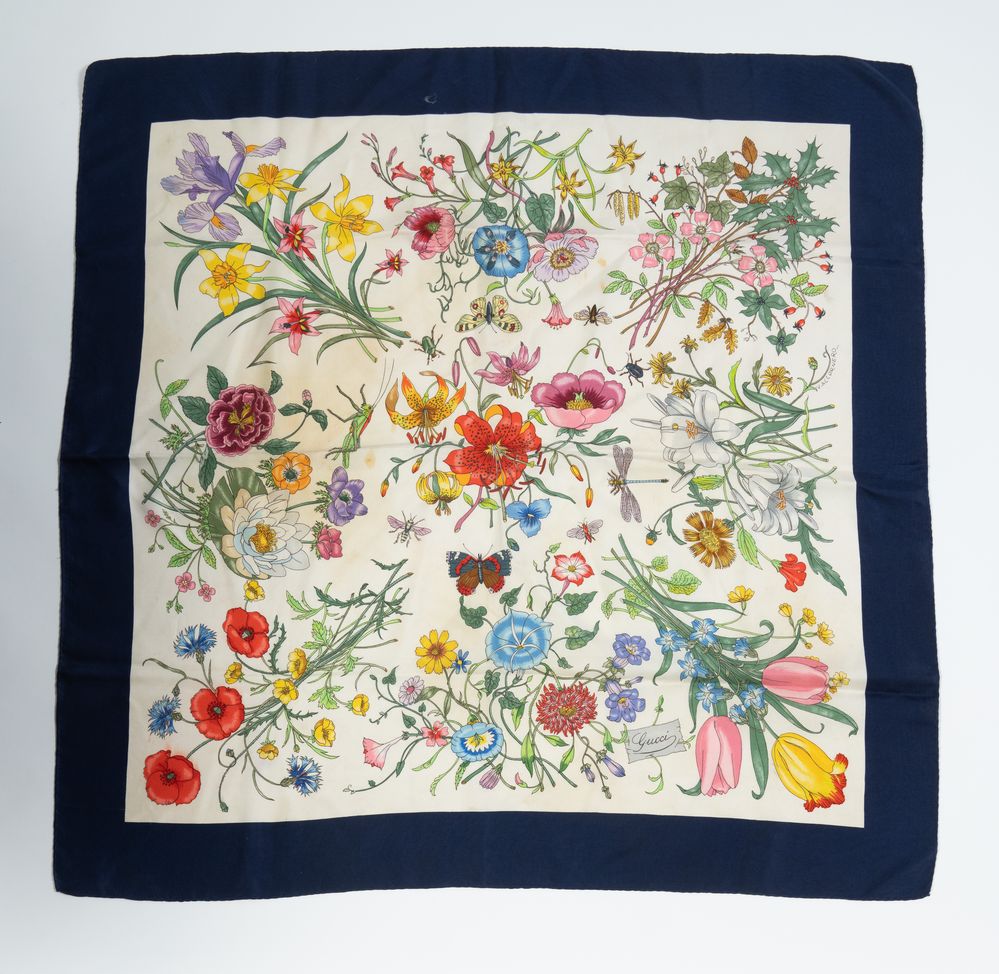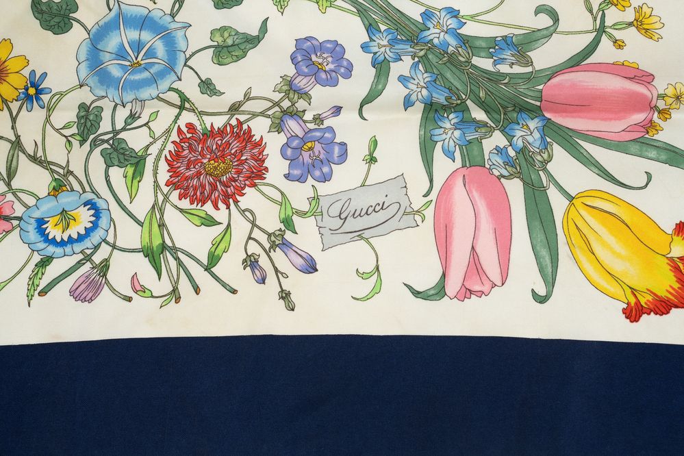 GUCCI Foulard floreale con bordo blu scuro in seta. Cm 85X85. (difettI)