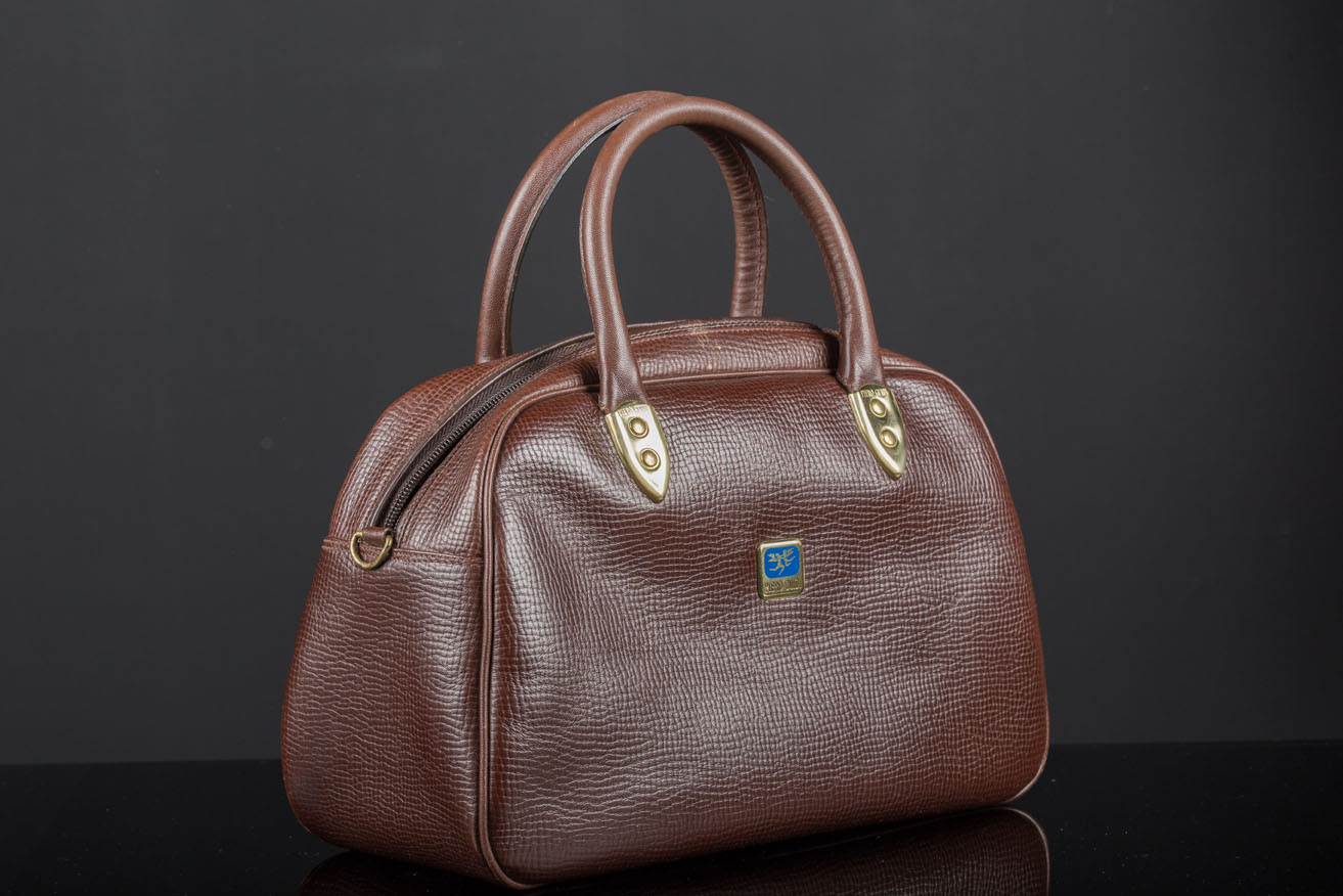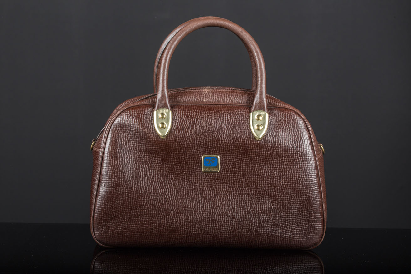 Embossed brown leather handbag. The interior is lined in brown fabric embossed with ochre-coloured angels who play instruments. It comes with its original bag cover.