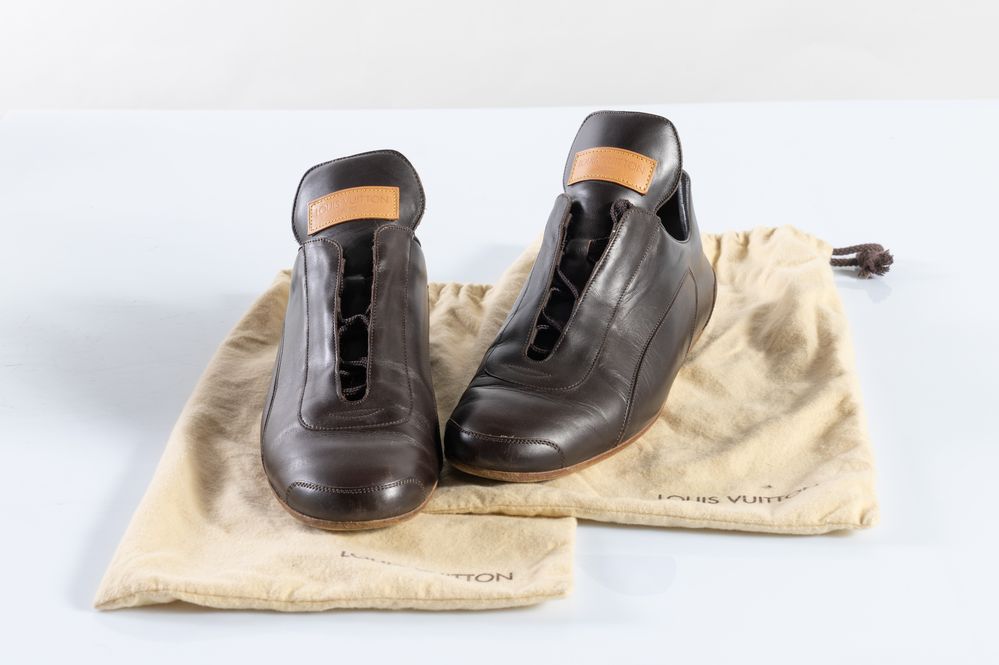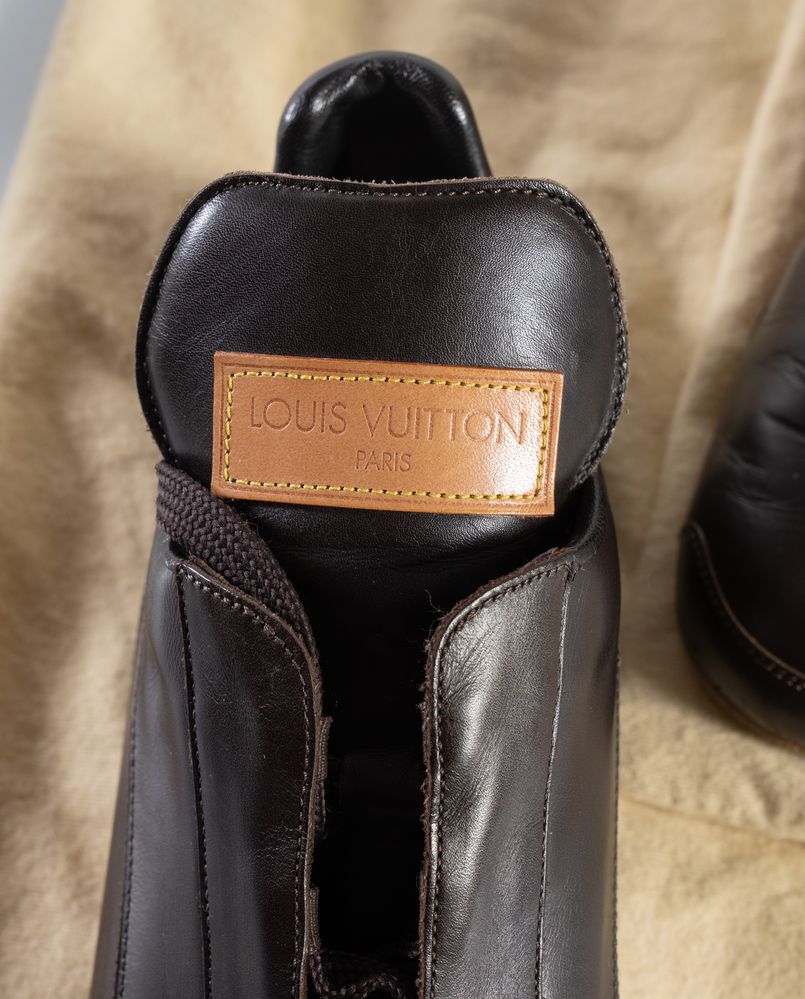 LOUIS VUITTON Sneakers in pelle marrone. Taglia riportata 7: vestono IT 42. Recano marchi LV, Louis Vuitton Paris. Corredate di dustabag.