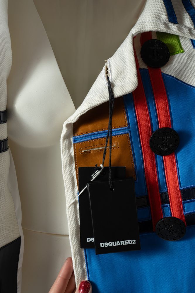 DSQUARED2 Giubotto doppiopetto Ocean Drive patches in cotone e inserti in pelle sintetica. Taglia riportata: IT 42. Composizione esterno 50% cotone, 48% canapa, 2% elastane; fodera 100% poliestere. Reca marchio Dsquared2 e Made in Italy. (nuovo)