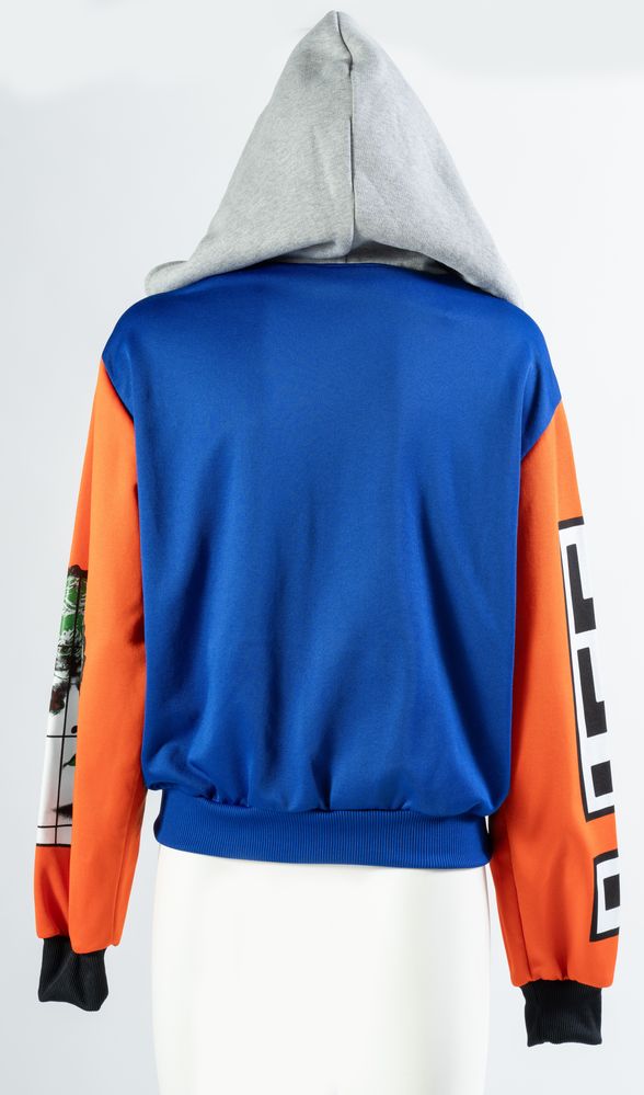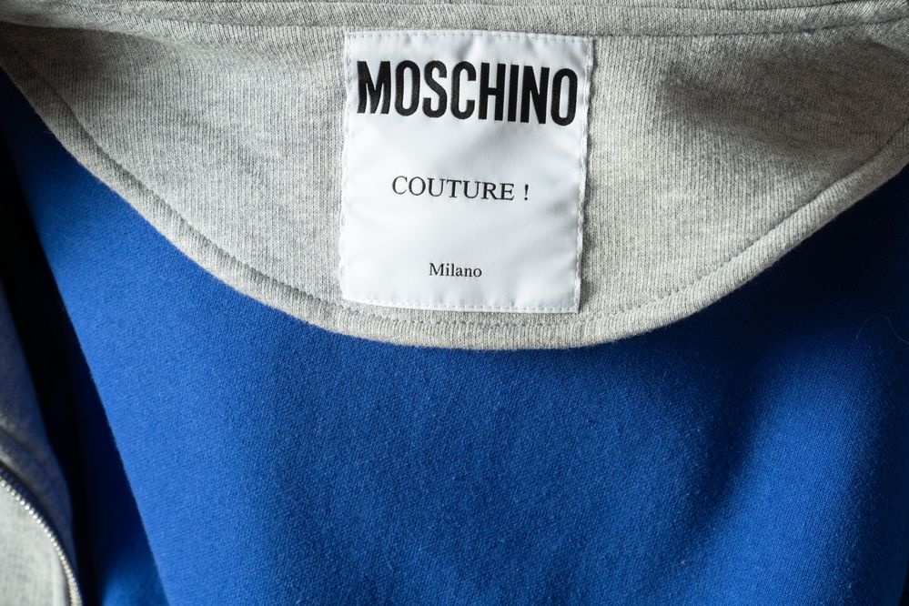 MOSCHINO COUTURE Felpa in cotone e polyester grigia, blu e arancione. Taglia riportata: IT 46. Composizione esterno 100% cotone e 57% polyester e 43% cotone; interno 96% rayon. Reca marchio Moschino Couture. (nuovo)