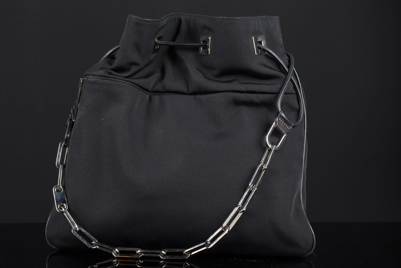 Gucci 1980'sBlack fabric bag with leather trim and long chain shoulder...
